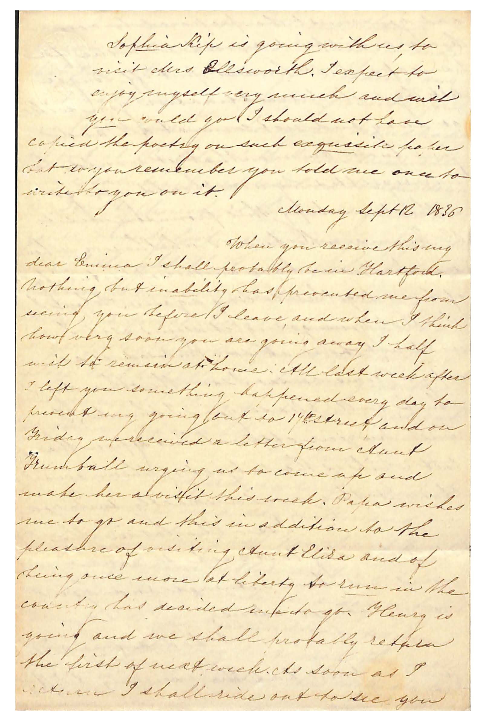 When you receive this my / dear Emma I shall probably be in Hartford. / Nothing but inability has prevented me from / seeing you before I leave and when I think / how very soon you are going away I half / wish to remain at home. All last week after / I left you something happened every day to / prevent my going out to 17th Street and on Friday we received a letter from Aunt / Trumbull urging us to come up and / make her a visit this week. Papa wishes / me to go and this in addition to the / pleasure of visiting Aunt Eliza and of / being once more at liberty to run in the / country has desired me to go. Henry is / going and we shall probably return / the first of next week. As soon as I / return I shall ride out to see you /