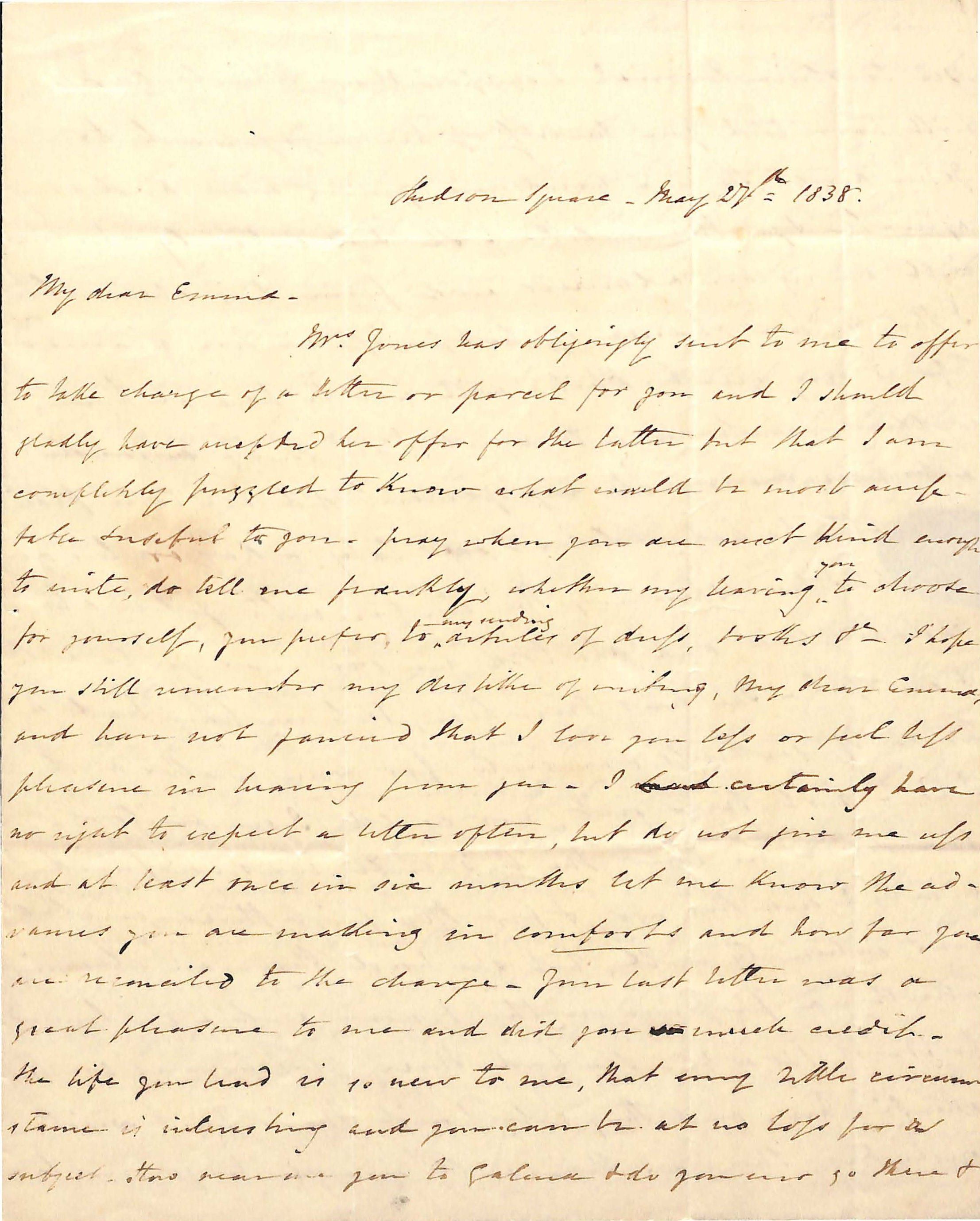 My dear Emma/ Mrs Jones has obligingly sent to me to offer / to take charge of a letter or parcel for your and I ahouls /gladly have accepted her off for the latter but that I am / completely puzzled to know what would be most ? / ?ful to you. Pray when you are most kind enough / to write do tell me frankly whether my having you to choose / for yourself, you prefer, to my sending articles of dress, books, etc. I hope / you will remember my dislike of writing, my dear Emma, / and have not perceived that I love you less or feel less / pleasure in hearing from you. I certainly have no right to expect a letter of the, but do not give me less / and at least once in six moths let me know the ad- / vances you are making in comforts and how far you / are reconciled to the change. Your last letter was a / great pleasure to me and did you much credit. / The life you had is so new to me, that any little circum / stance is interesting, and you can be at no loss for a / subject. How near are you ? and do you ever go there and /see Caroline Morris? I suppose Mary Rhinelander / will have told you herself of her engagement to John King. He is a handsome your man and very / agreeable and gentleman like. She has certainly chosen / well among her admirers and rom his character / I think her chance of happiness in her married / life is very great I ? will not be here at her / wedding, which she will regret, I am sure [word crossed out] / [words crossed out} The engagement did not take place/ ‘til after he had sailed. I saw Caty a day or two ago / who has been spending the winter with Julia at Philadelphia, and she told me she was quite well / and cheerful. She has been here but we have had / bouts of sickness and anxiety for some months and / I have not been well, nor could I see visitors. / Our sister in law, the Dr.’s wife, was confined / nearly 2 months ago, and for the first three months / was extremely well, but she had then an alarming / attack – a pressure on the brain and a continued / pulse of 120 or 30. She had three physicians constantly / attending her, and they only paid their last visit / yesterday. She was then well enough to go over to / her father’s ? Knight, three miles from Hoboken. / and George who had just come over, says she has been / sick and I ? not extremely well. We have been very / much disturbed, but are now quite easy about her. / tho’ her pulse is still ? llly high. David went / yesterday to Philadelphia again himself. He is still / President of the gas Company and likes his occu /pation very well. WE are, I hope, settled entirely / with ?. He does not express / any wish to go to housekeeping and we ladies are too comfortable thus far / being together not to demand any changes. George ? wife have been here the whole winter with us, and / with ? oldest child 14 months old, has been a delight to us. ? Pray tell me particularly about ? and her little / family. David left his ? for ? and ? beg your / acceptance of the enclosed $25. We send gold to / give you no trouble about bills. It is said positively / that your uncle Ogden Hoffman is engaged to Virginia / Southard. She is a pretty ladylike girl, I know. I do not know her myself. I know your family write / pretty regularly as I have said little about them. / Your must tell me when you who you wish to hear about, that I / am in the way of seeing. Mary ? had a lover, Montgomery Livingston, a son of Robert L’s. but her mother will not let her enjoy herself as she is too young. That is her only objection , so if is constant, 2 or 3 years /she will certainly marry him. He is feet 2, and very handsome / and that is all I know of him. He is just returned from / abroad and is just 21 himself. / Good bye, dear Emma, and believe me very truly your friend F. C. Colden