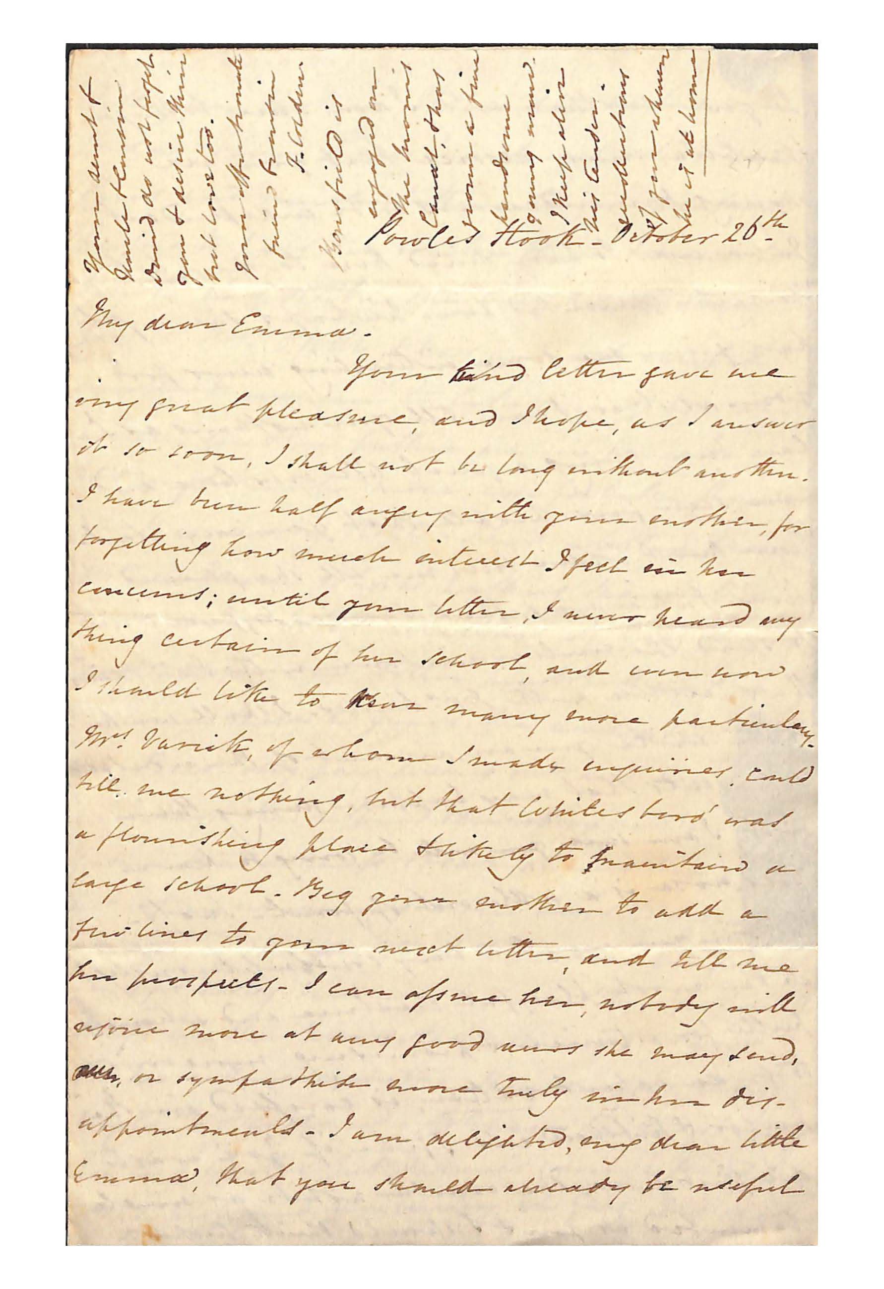 Your [?kind] letter gave me / my great pleasure, and I hope, as I answer / it so soon, I shall not be long without another. / I have been half angry with your mother for / forgetting how much interest I feel in her / concerns; until your letter I never heard any / thing certain of her school, and even how / I should like to hear many more particulars. / Mrs. Varick of whom I made inquiries could / tell me nothing but that Whitesboro was / a flourishing place + likely to maintain a / large school. Beg your mother to add a / few lines to your next letter, and tell me / her prospects. I can assure her. Nobody will / rejoice more at any good news she may send / or sympathise [sic] more truly in her dis - / appointments. I am delighted, my dear little / Emma, that you should already be useful /