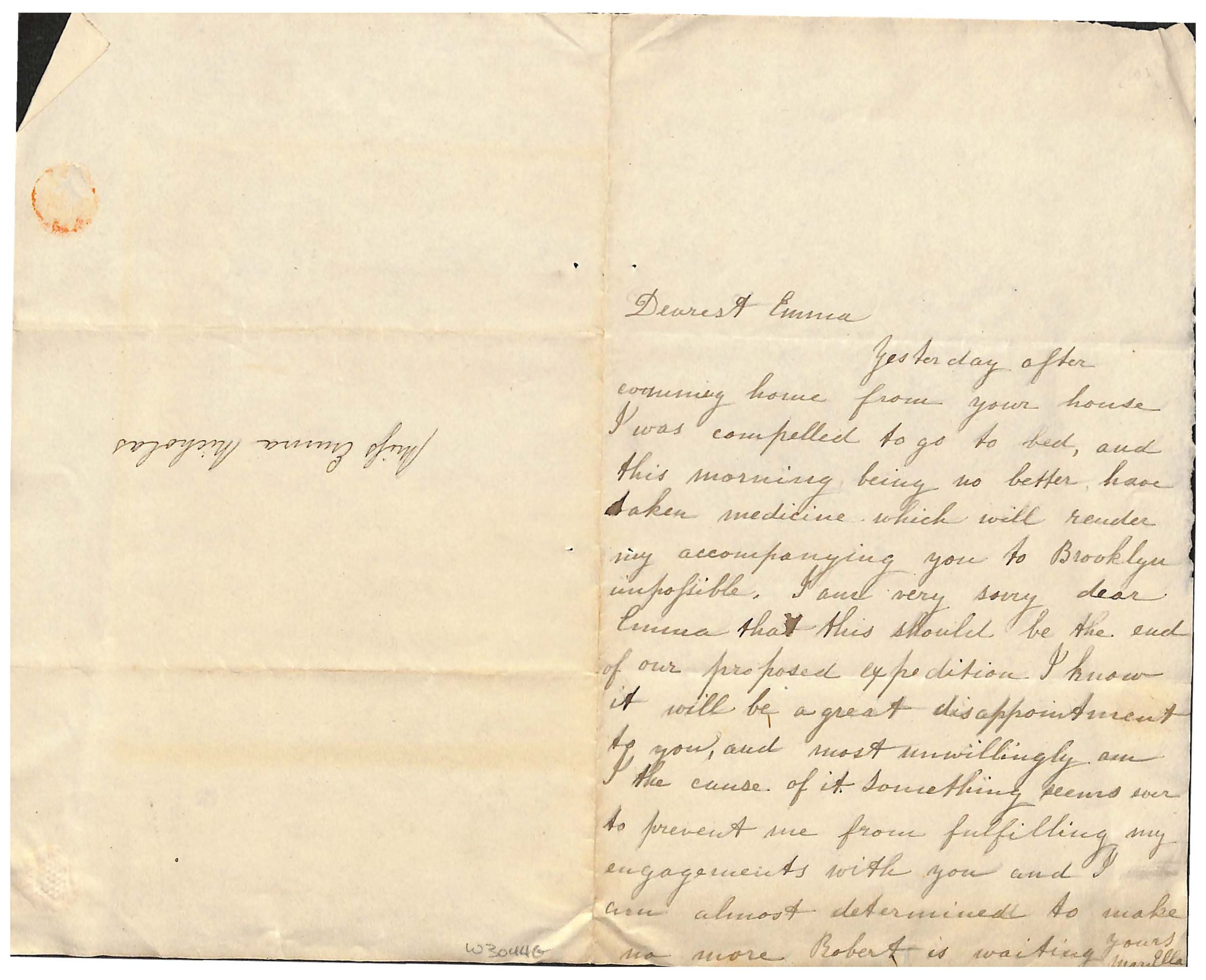Yesterday after / coming home from your house / I was compelled to go to bed, and / this morning being no better have / taken medicine which will render / my accompanying you to Brooklyn / impossible. I am very sorry dear / Emma that this should be the end / of our proposed expedition. I know / it will be a great disappointment / to you, and most unwillingly am / I the cause of it. Something seems ever / to prevent me from fulfilling my / engagements with you and I / am almost determined to make no more. Robert is waiting /