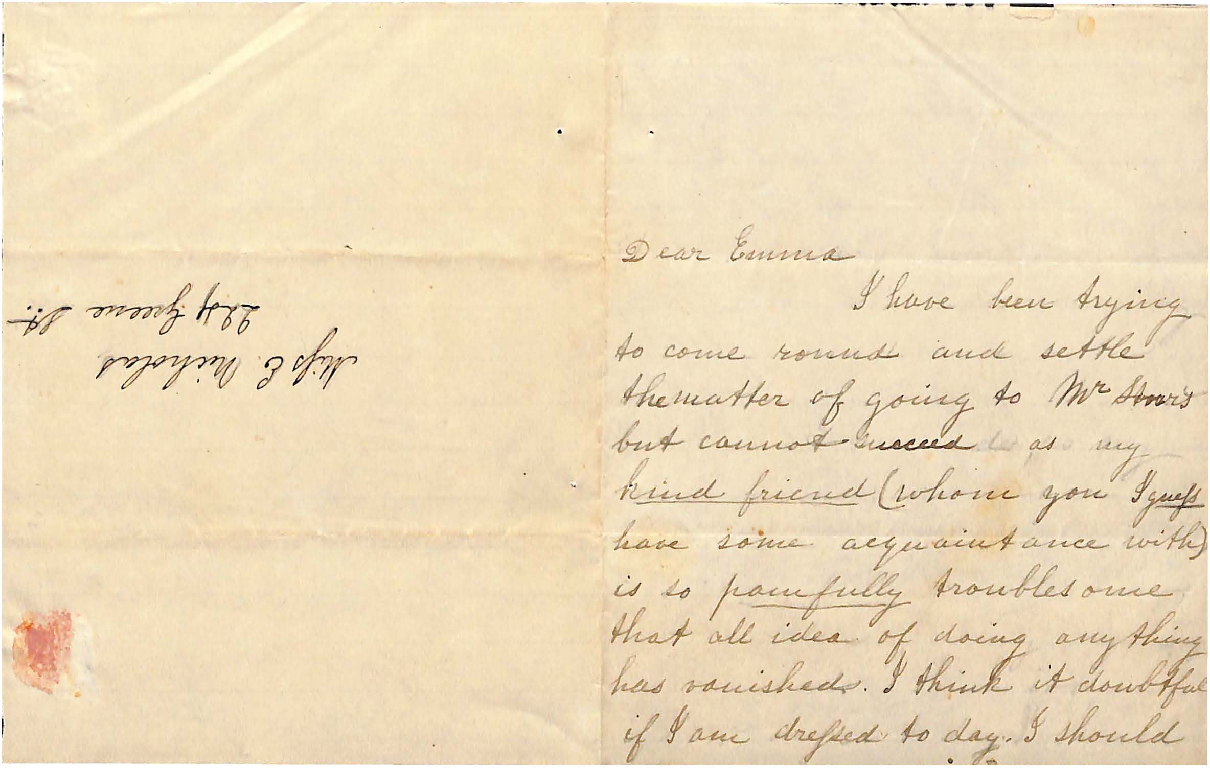 I have been trying / to come round and settle / the matter of going to Mr Storrs / but cannot succeed as my / kind friend (whom you I guess / have some acquaintance with) / is so painfully troublesome / that all idea of doing any thing / has vanished. I think it doubtful / if I am dressed to day. I should /