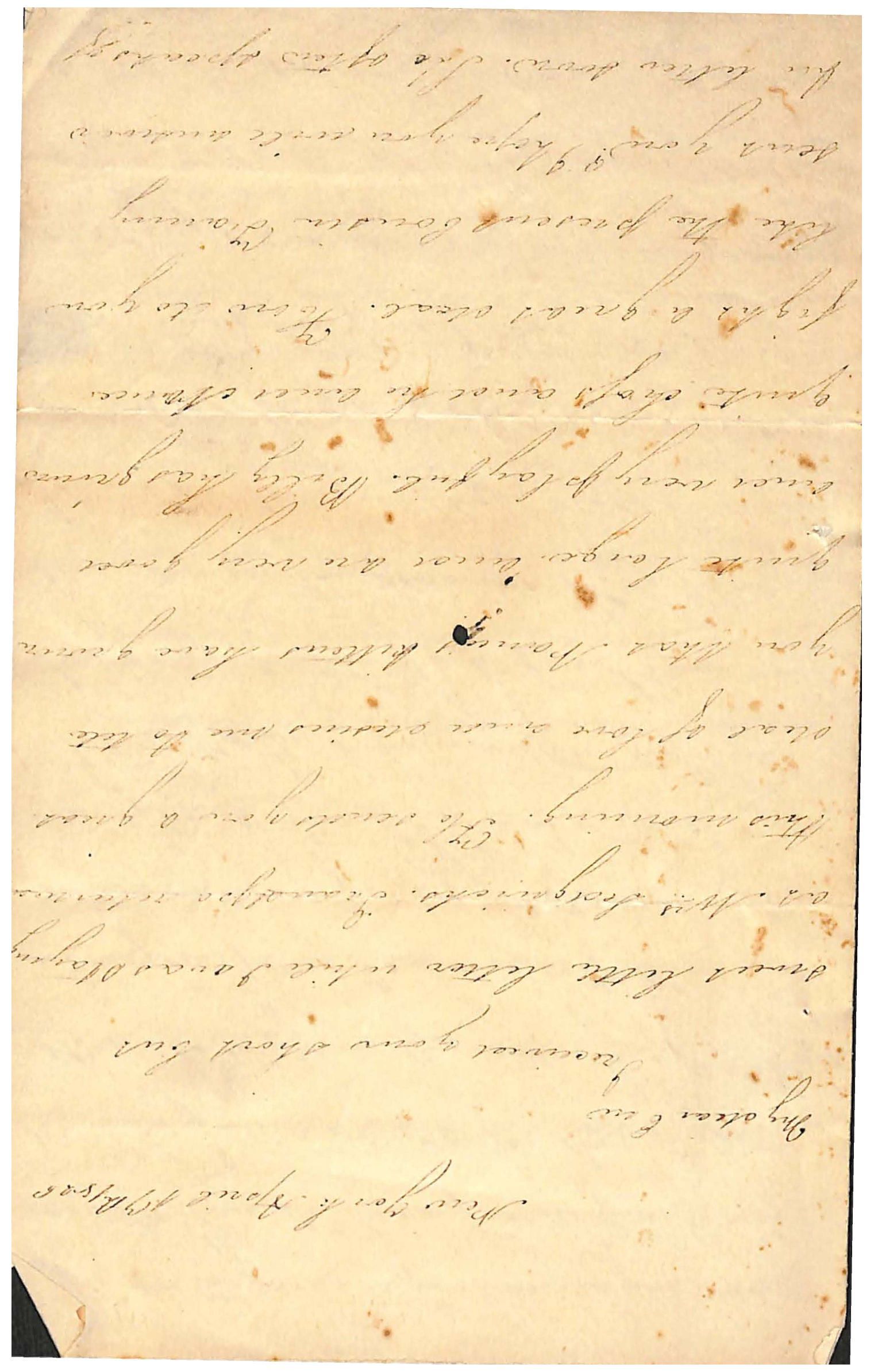 You with great affection and she / would like to hear from you very / much. Julia sends her love to you / she will eventually write by Mr [?] / Are you going to have cotillion / parties once a fortnight? And where / are you going to have them? / Tell Mother I believe Uncle Phil / has gone to the Lake for I have not seen him since the [?] day that / Jean [?] town. How does French / school come on? Ask Mother if I may / not have the frock that cousin / Fanny gave me dyed a margarine / blue. Tell her it is very much foiled / and that I have worn it a great /