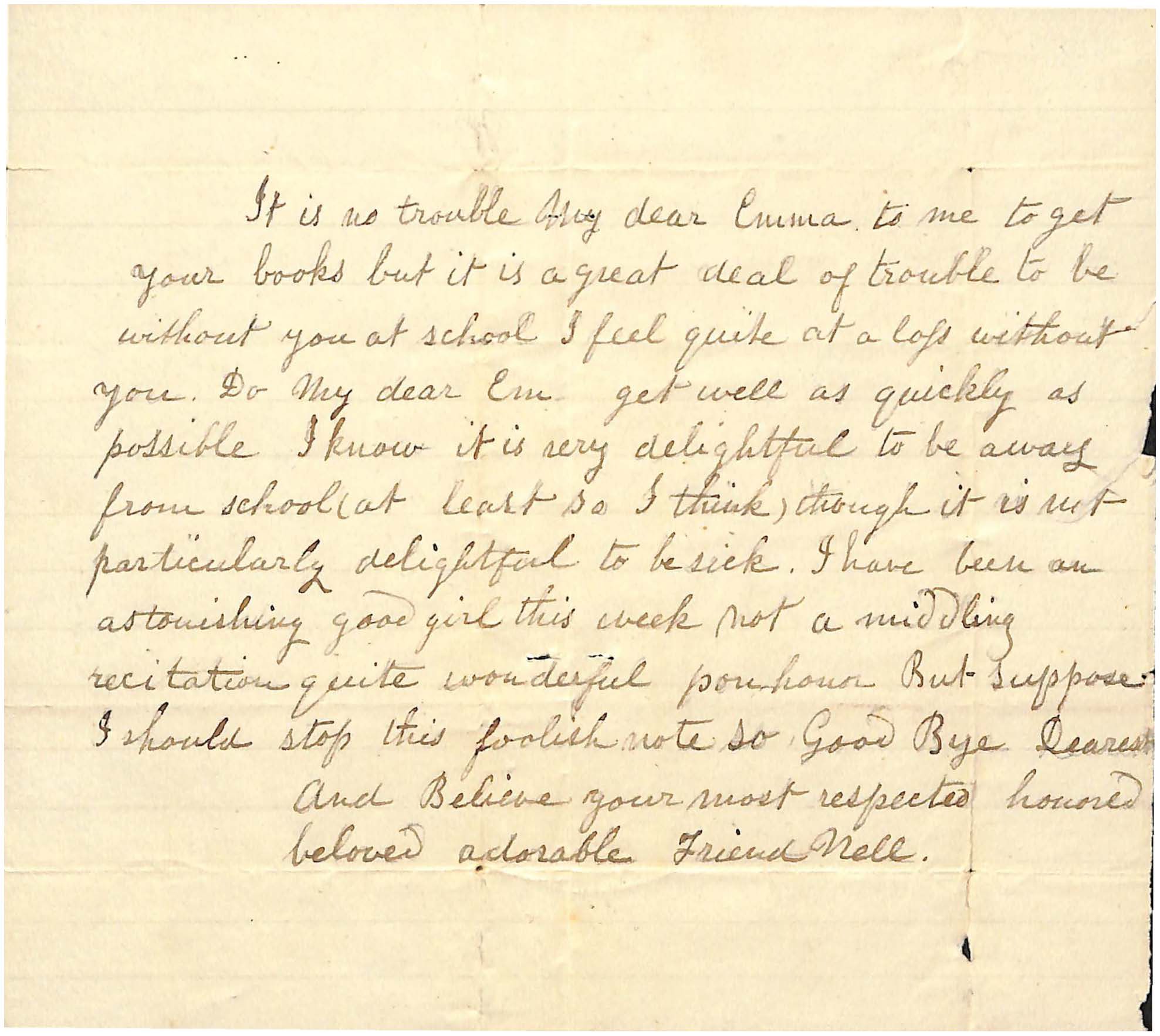 It is no trouble my dear Emma to me to get / your books but it is a great deal of trouble to be / without you at school I feel quite at a loss without / you. Do my dear Em get well as quickly as / possible I know it is very delightful to be away / from school (at least so I think) though it is not / particularly delightful to be sick. I have been an / astonishing good girl this week not a middling / recitation quite wonderful [unrecovered?] But suppose / I should stop this foolish note so Good Bye Dearest /