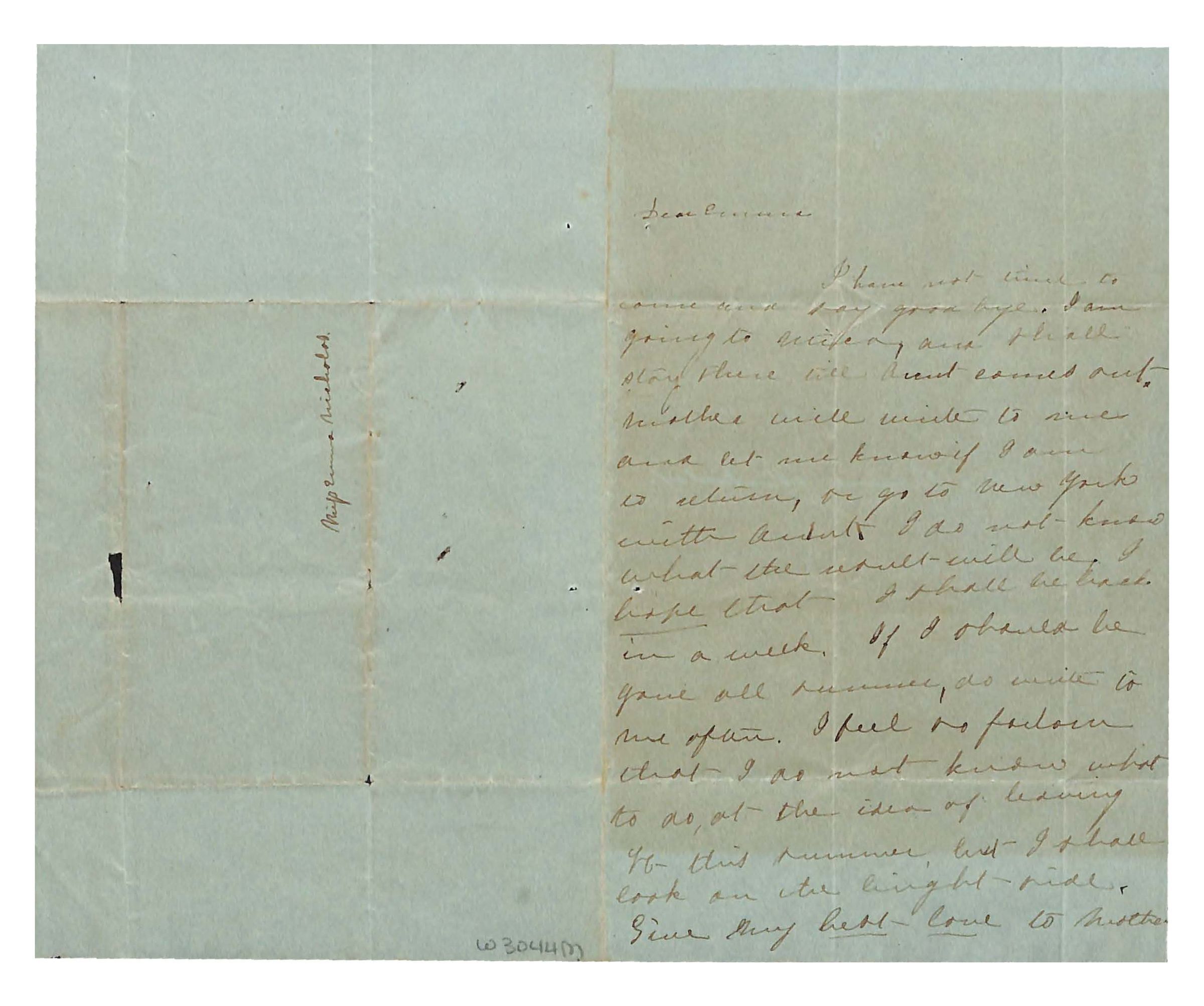 I have not time to / come and say good bye. I am going to Utica, and shall / stay there till Aunt comes out. / Mother will write to me / and let me know if I am / to return, or go to New York / with Aunt. I do not know / what the result will be. I / hope that I shall be back / in a week. If I should be / gone all summer, do write to / me often. I feel so forlorn / that I do not know what / to do at the idea of leaving / [“H”?] this summer but I shall look on the bright -side. Give my best love to Mother /
