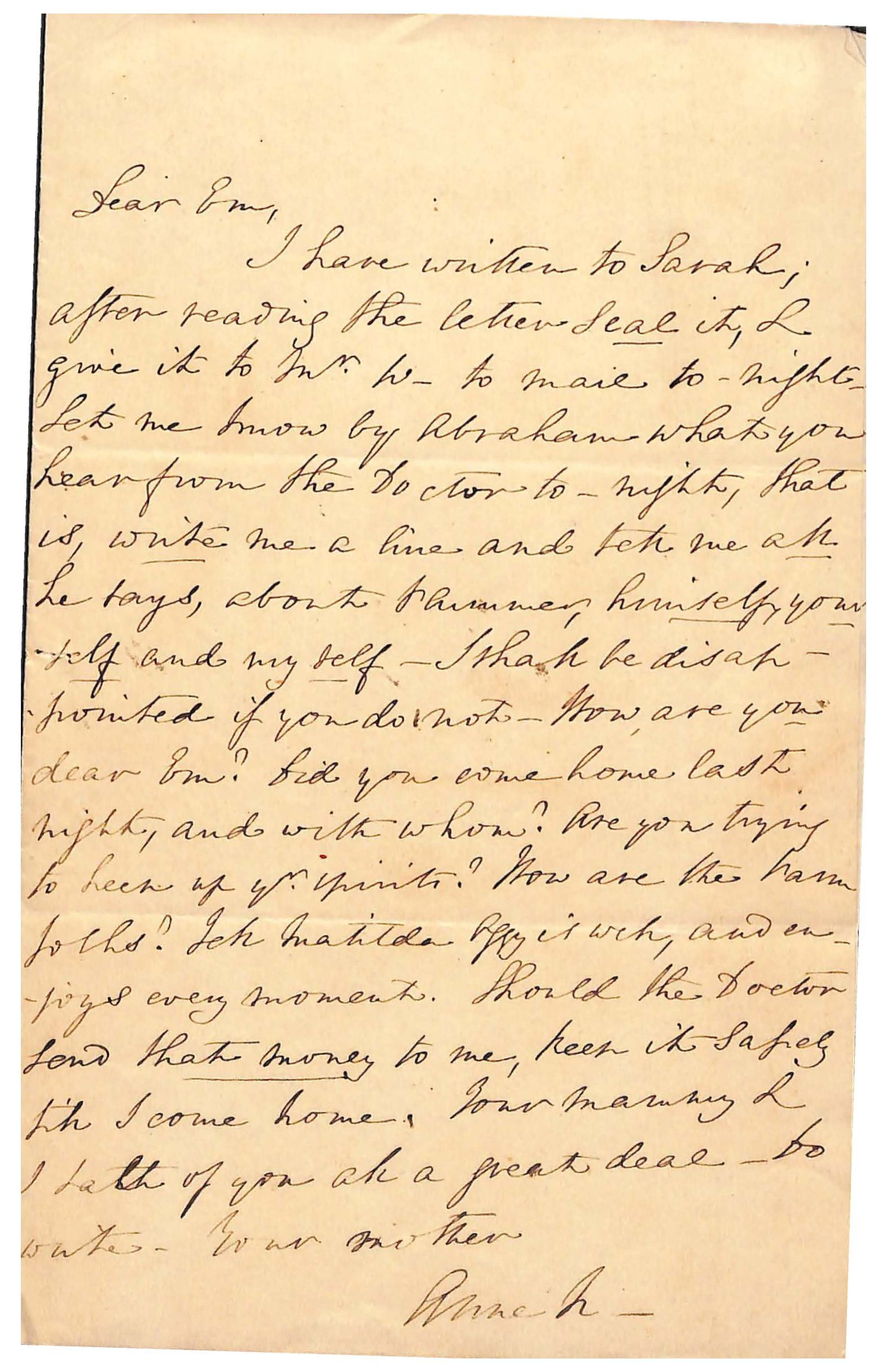 I have written to Sarah; / after reading the letter seal it, & / give it to Mr. W_ to mail to - night. / Let me know by Abraham what you / hear from the Doctor to - night, that / is write me a line and tell me all / he says, about [unrecovered], himself, your / self, and my self _ I shall be disap - / pointed if you do not _ How are you / dear Em? Did you come home last / night, and with whom? Are you trying / to keep up yr spirits? How are the [home] / folks? Tell Matilda Oggy is well, and en- / joys every moment. Should the Doctor / send that money to me, keep it safely / till I come home. Your Mammy & I / talk of you all a great deal _ do write _ your mother