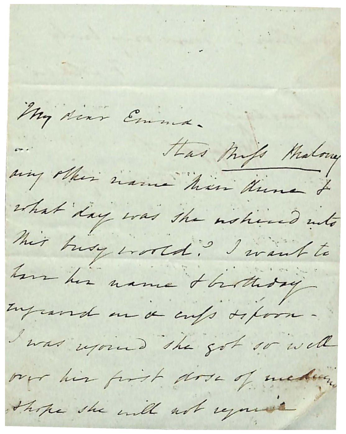Has Miss Maloney / any other name than Anne + / what day was she ushered into / the busy world? I want to / have her name + birthday / engraved on a cup + spoon / I was rejoiced she got so well / over her first does of medicine / + hope she will not require /