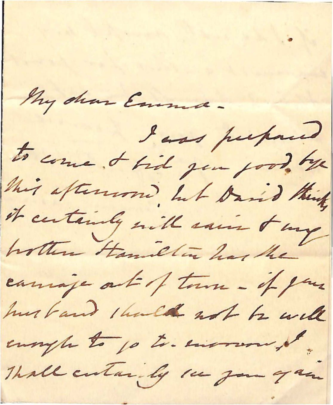 I was prepared / to come + bid you good bye / this afternoon, but David thinks / it certainly will rain + my / brother Hamilton has the / carriage out of town _ it your / husband should not be well / enough to go to - morrow I / shall certainly see you again /