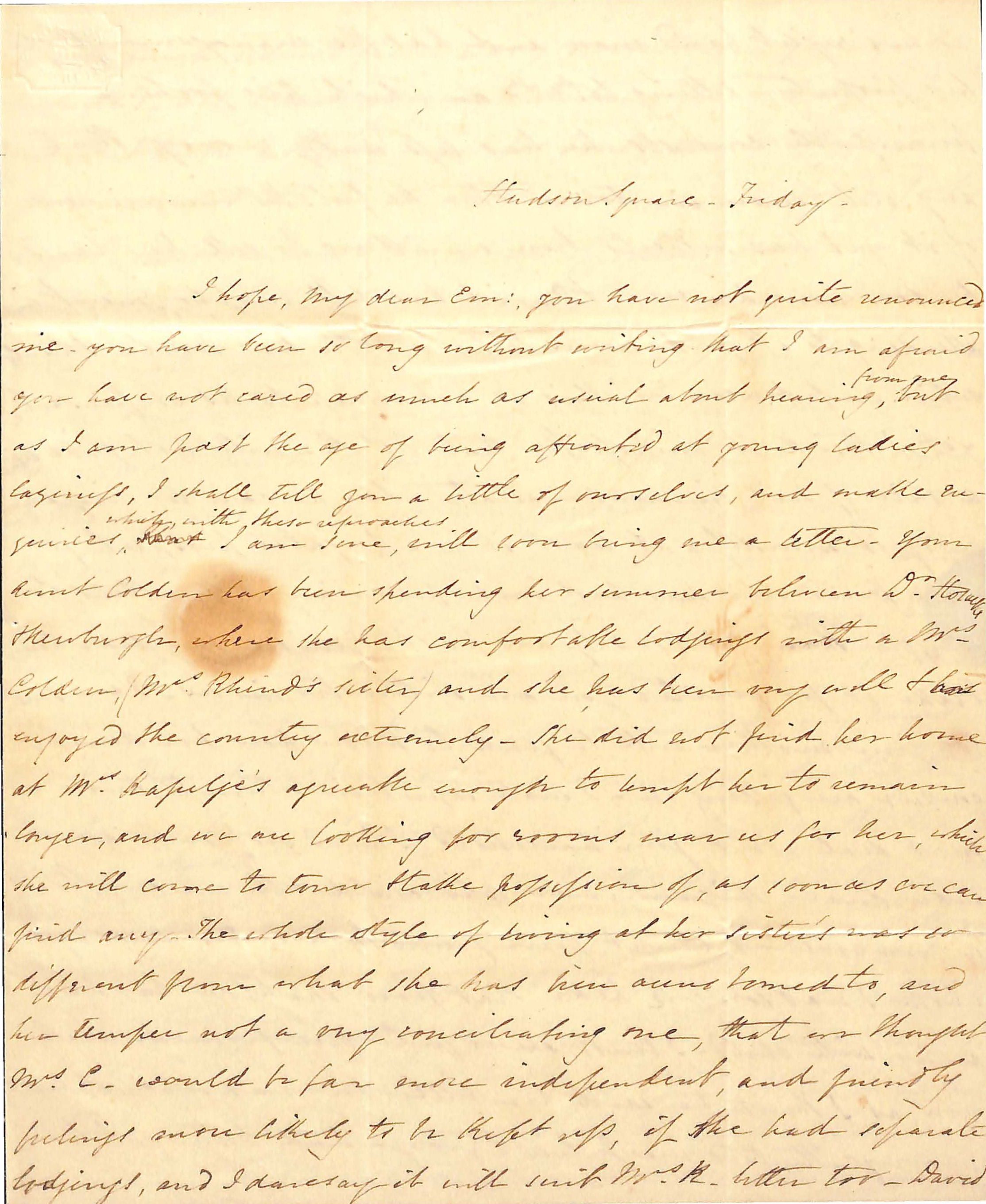 I hope, my dear Em, you have not quite renounced / me _ you have been so long without writing that I am afraid / you have not cared as much as usual about hearing [^from me] but / as I am past the age of being affronted at young ladies / laziness, I shall tell you a little of ourselves, and make en - / quiries [crossed out ^ which with these repoaches] I am sure, will soon bring me a letter _ Your / Aunt Colden has been spending her summer between Dr. H[>owell’s?] / + Newburgh, where she has comfortable lodgings with a Mrs. / Colden (Mrs. Rhind’s sister) and she has been very well + [crossed out] / enjoyed the country extremely _ she did not find her home / at Mrs R[apilje’s?] agreeable enough to tempt her to remain / longer, and we are looking for rooms near us for her, which / she will come to town + take possession of, as soon as we can / find any. The whole style of living at her sister’s was so / different from what she has been accustomed to, and / her temper not a conciliating one, that we thought / Mrs C. would be far more independent, and friendly / feelings more likely to be kept up, if she had separate / lodgings, and I dare say it will suit Mrs. R better too _ David