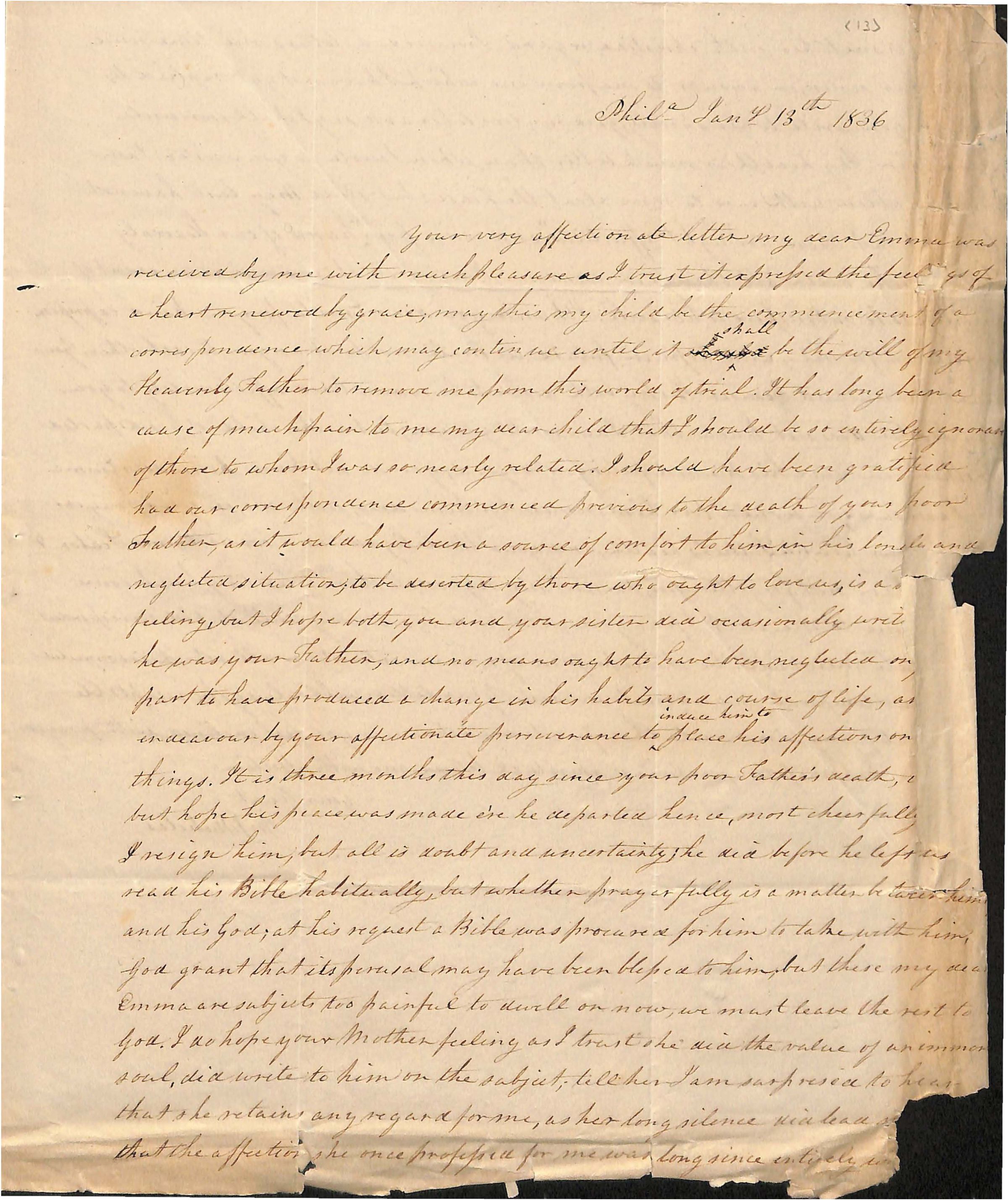 Your very affectionate letter my dear Emma was / received by me with much pleasure as I trust it expressed the feelings of / a heart renewed by grace; may this my child be the commencement of a correspondence which my continue until it [crossed out] [^ shall ] be the will of my / Heavenly Father to remove me from this world of trial. It has long been a / cause of much pain to me my dear child that I should be so entirely ignorant / of those to whom I was so nearly related. I should have been gratified / had our correspondence commenced previous to the death of your poor / Father, as it would have been a source of comfort to him in his lonely and / neglected situation; to be deserted by those who ought to love us is a [page folded] /