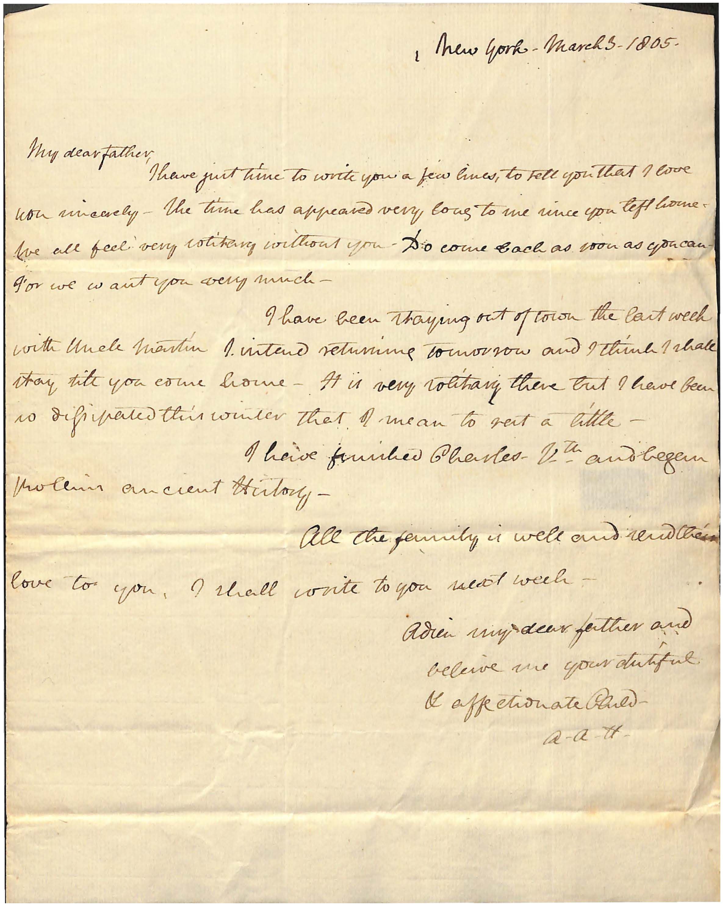 I have been staying out of town the last week / with Uncle Martin. I intend returning tomorrow and I think I shall / stay till you come home. It is very solitary there but I have been / so dissipated this winter that I mean to rest a little _