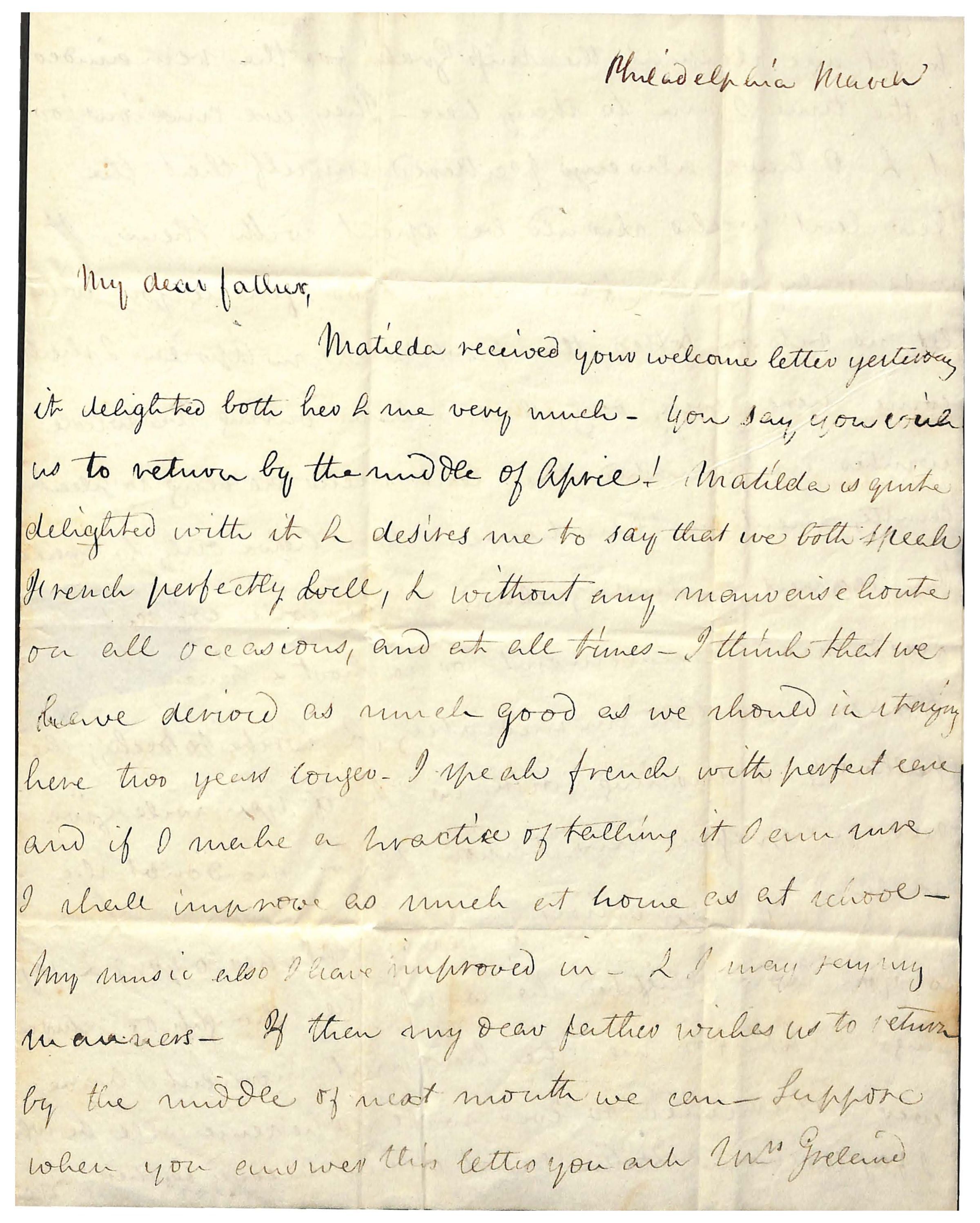 Matilda received your welcome letter yesterday / it delighted both her & me very much _ you say you wish / us to return by the middle of April ! _ Matilda is quite _ / delighted with it & desires me to say that we both speak / French perfectly well, & without any [French phrase] e houte / on all occasions, and at all times _ I think that we have derived as much good as we should in staying / here two years longer _ I speak french with perfect ease / and if I make a practice of talking it I am sure / I shall improve as much at home as at school _ / My music also I have improved in _ & I may say my / manners _ If then my dear father wishes ys to return / be the middle of next month we can _ Suppose / when you answer this letter you ask Mrs Grelaud /