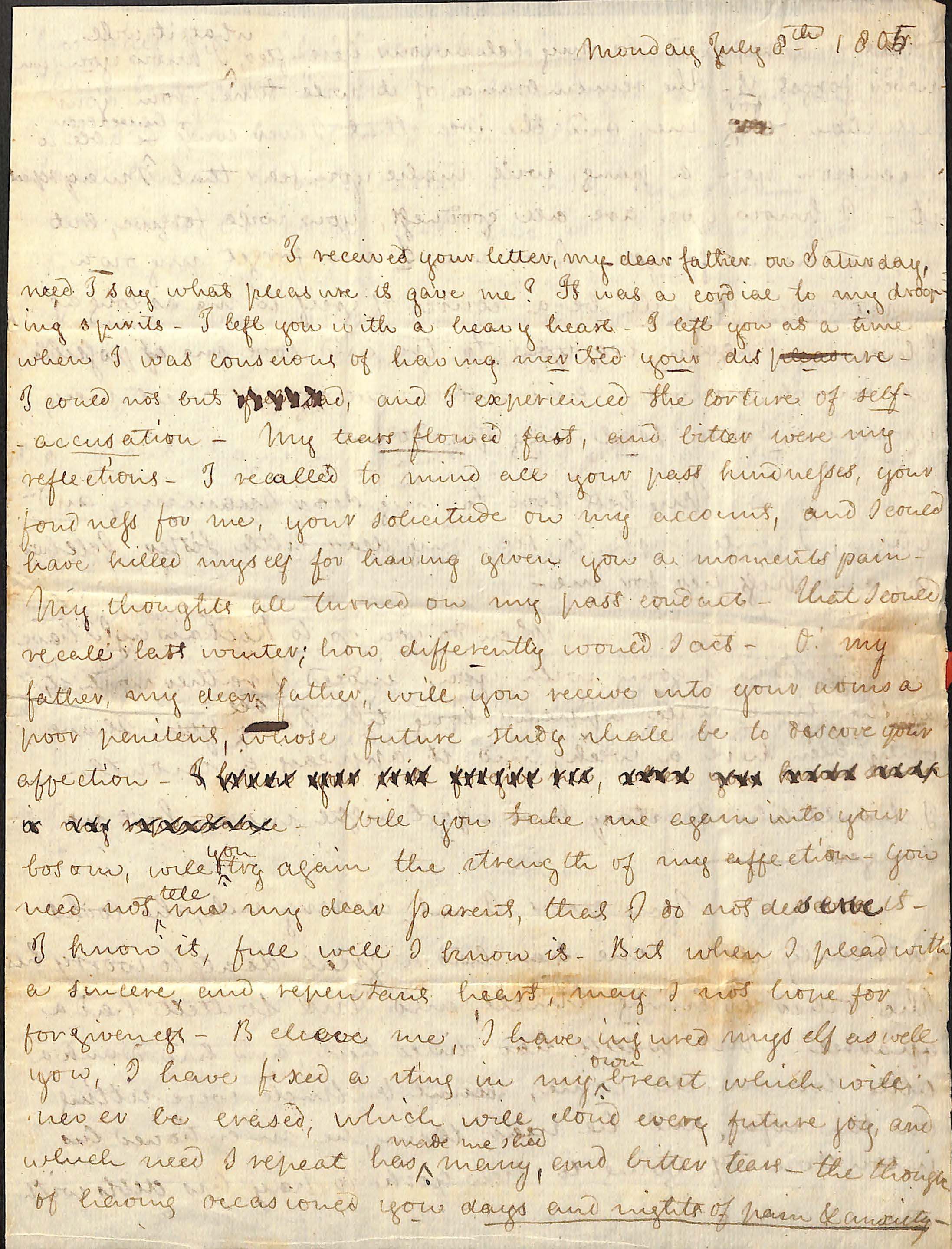 I received your letter my dear father on Saturday, / need i say what pleasure it gave me? It was a cordial to my droop - / ing spirits- I left you with a heavy heart- I left you at a time / when I was conscious of having merited your displeasure-/ I could not but [crossed out] and I experienced the torture of self - / accusation- My tears flowed fast and bitter were my / reflections- I recalled to mind all your past kindnesses. Your / fondness for me, your solicitude on my accounts, and I could / have killed myself for having given you a moments pain- / My thoughts all turned on my past conduct- That I could recall last winter; how differently would I act- O! My / father, my dear father, will you receive into your arms a / poor penitent whose future study shall be to deserve your / affection [crossed out words] / Will you take me again into your / bosom, will [inserted: you] try again the strength of my affections- you / need not [inserted: tell] me my dear parent that I do not deserve it- / I know it, full well, I know it- But when I plead with / a sincere and repentant heart my I not hope for / forgiveness- Believe me, I have injured myself as well / you, I have fixed a sting in my [inserted: own] breast which will never be erased, which will cloud every future joy, and / which need I repeat has [inserted: made me shed] many and bitter tears- the thought / of having occasioned you days and nights of pain and anxiety /