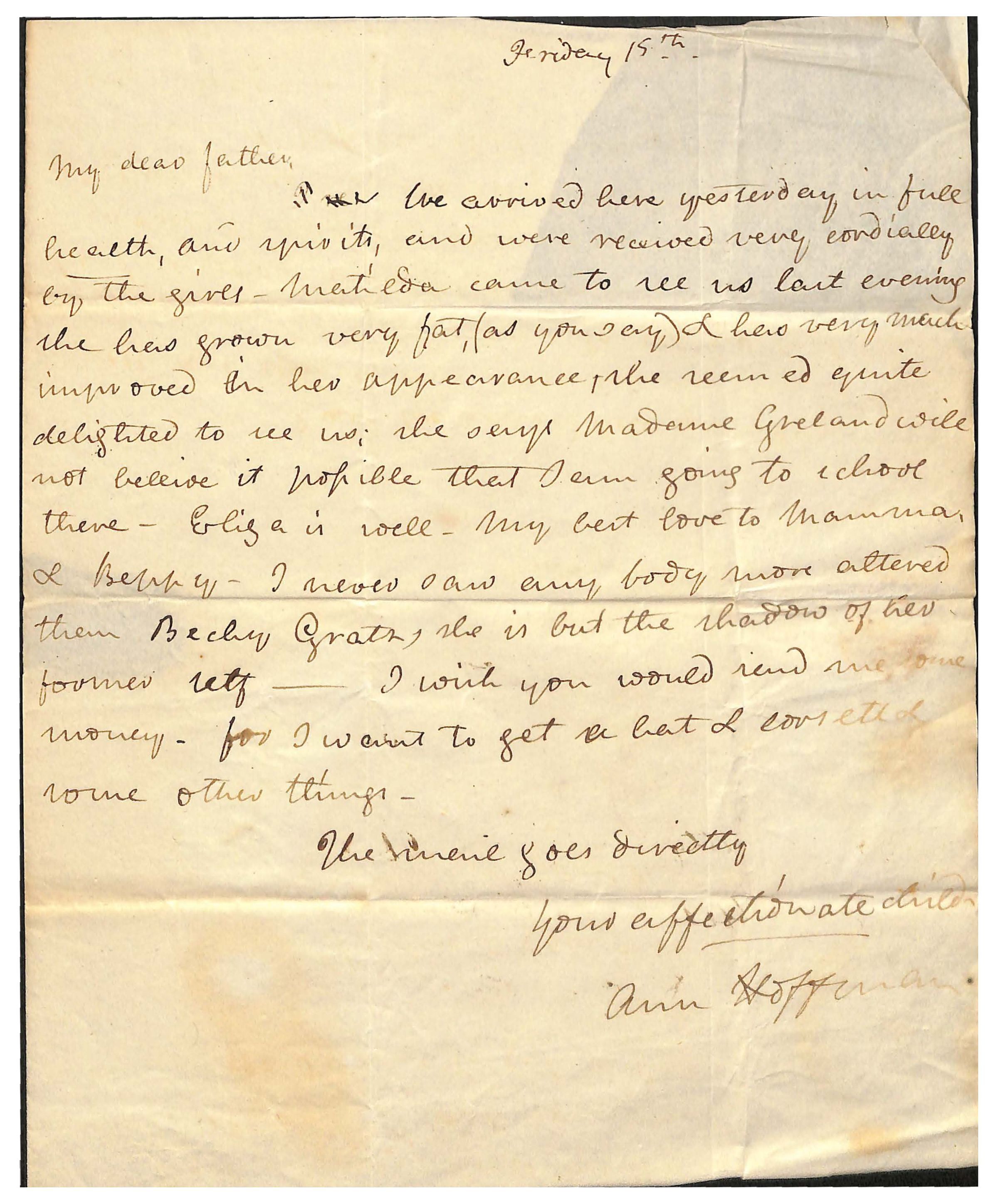 *Original spelling retained throughout work; content appears exactly as written. [PAGE 1] Friday 15th- - My dear father / [crossed out] We arrived here yesterday in full / health and spirits, and were received very cordially / by the girls- Matilda came to see us last evening / she has grown very fat,(as you say) & has very much / improved in her appearance, she seemed quite delighted to see us; she says Madame Grelaud will / not believe it possible that I am going to school / there- Eliza is well- My best love to Mamma / and Bessy- I never saw any body more altered / then Becky Gratz, she is but the shadow of her / former self- I wish you would send me some / money- for I want to get a hat & a corset / & some other things- The mail goes directly, / Your affectionate child/Ann Hoffman [END OF PAGE 1] [Address; written on letter] Josiah Ogden Hoffman EsqOpposite the post office -William StreetNew York [Top of Page]Ann Hoffman [END OF LETTER] [Postmark] PHI, NO 15Created By