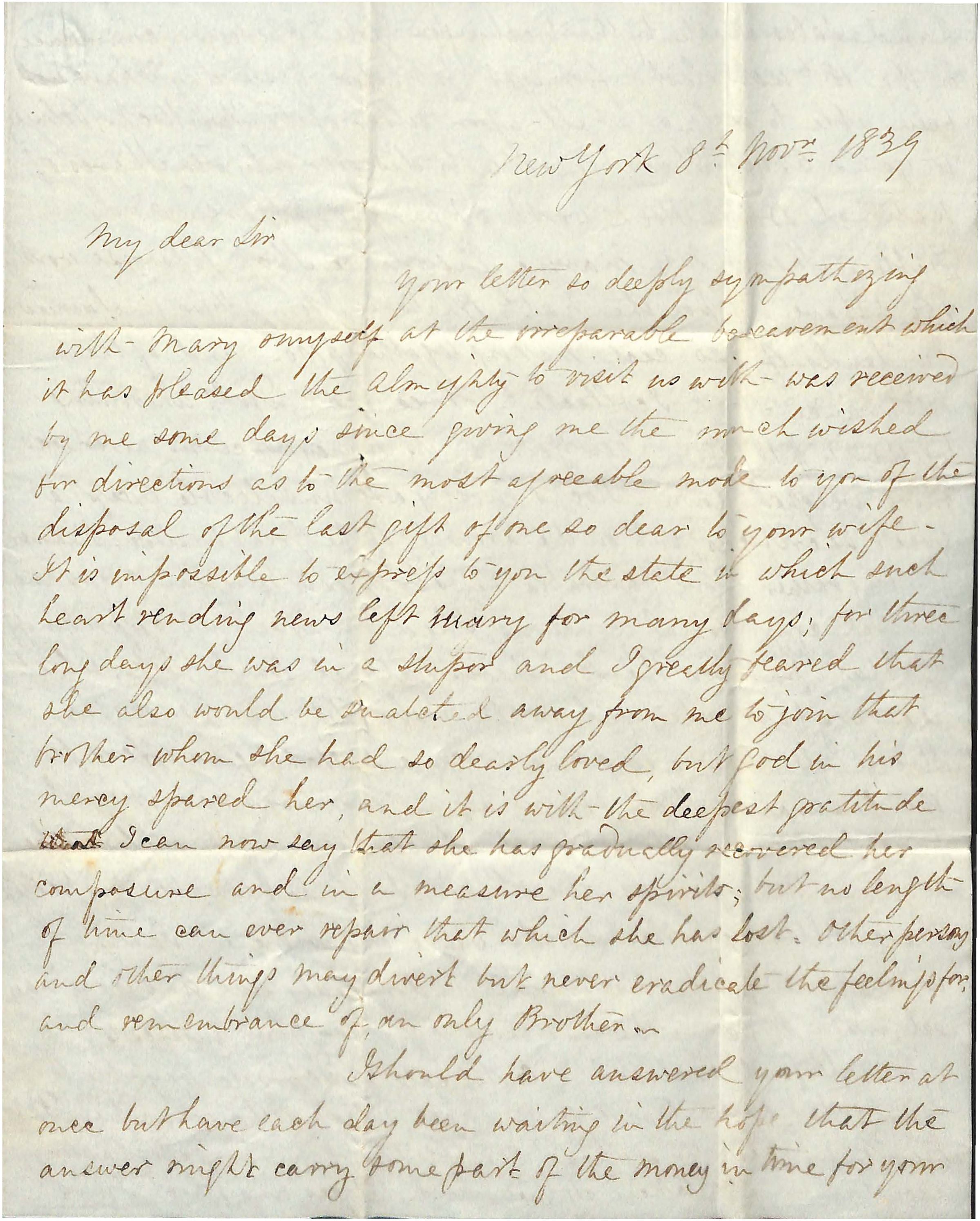 Your letter so deeply sympathizing / with Mary + myself at the irreparable bereavement which / it has pleased the Almighty to visit us with was received / by me some days since giving me the must wished / for directions as to the the most agreeable mode to you of the / disposal of the last gift of one so dear to your wife _ / It is impossible to express to you the state in which such / heart rending news left Mary for many days; for three / long days she was in a stupor and I greatly feared that she also would be snatched away from me to join that / brother whom she had so dearly loved, but God in his / mercy spared her, and it is with the deepest gratitude / that I can now say that she had gradually recovered her / composure and in a measure her spirits; but no length / of time can ever repair that which she has lost. Other persons / and other things may divert but never eradicate the feelings for / and remembrance of an only Brother _