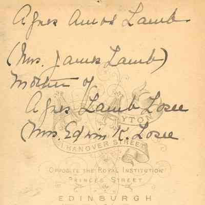 A formal Edinburgh studio portrait of a woman identified as Agnes A Lamb (Mrs. James Lamb) who was the mother of Agnes Lamb Losee (Mrs. Edwin K Losee).Photograph Details