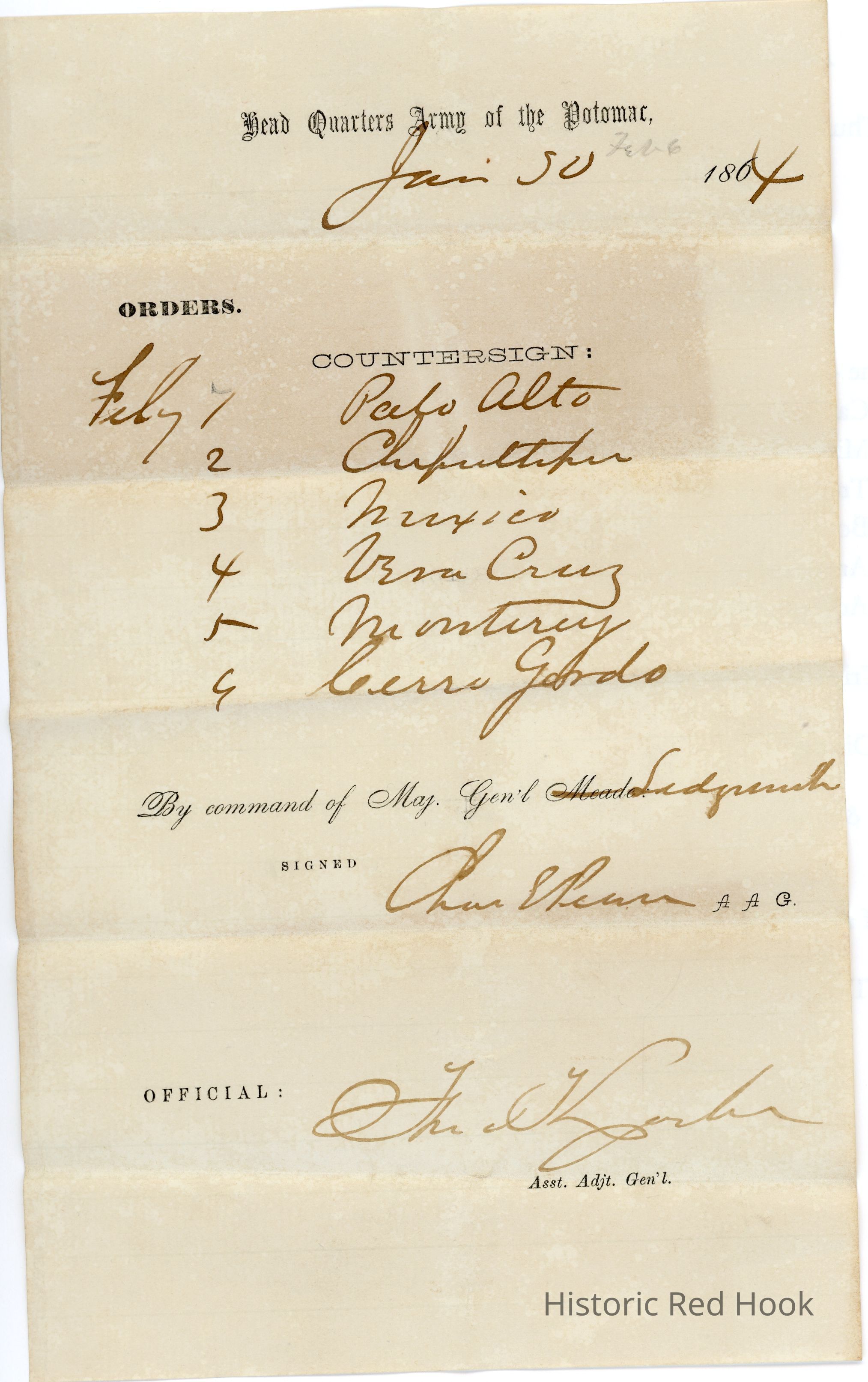 Dates and place names on letterhead "Head Quarters Army of the Potomac," Jan 30, 1864