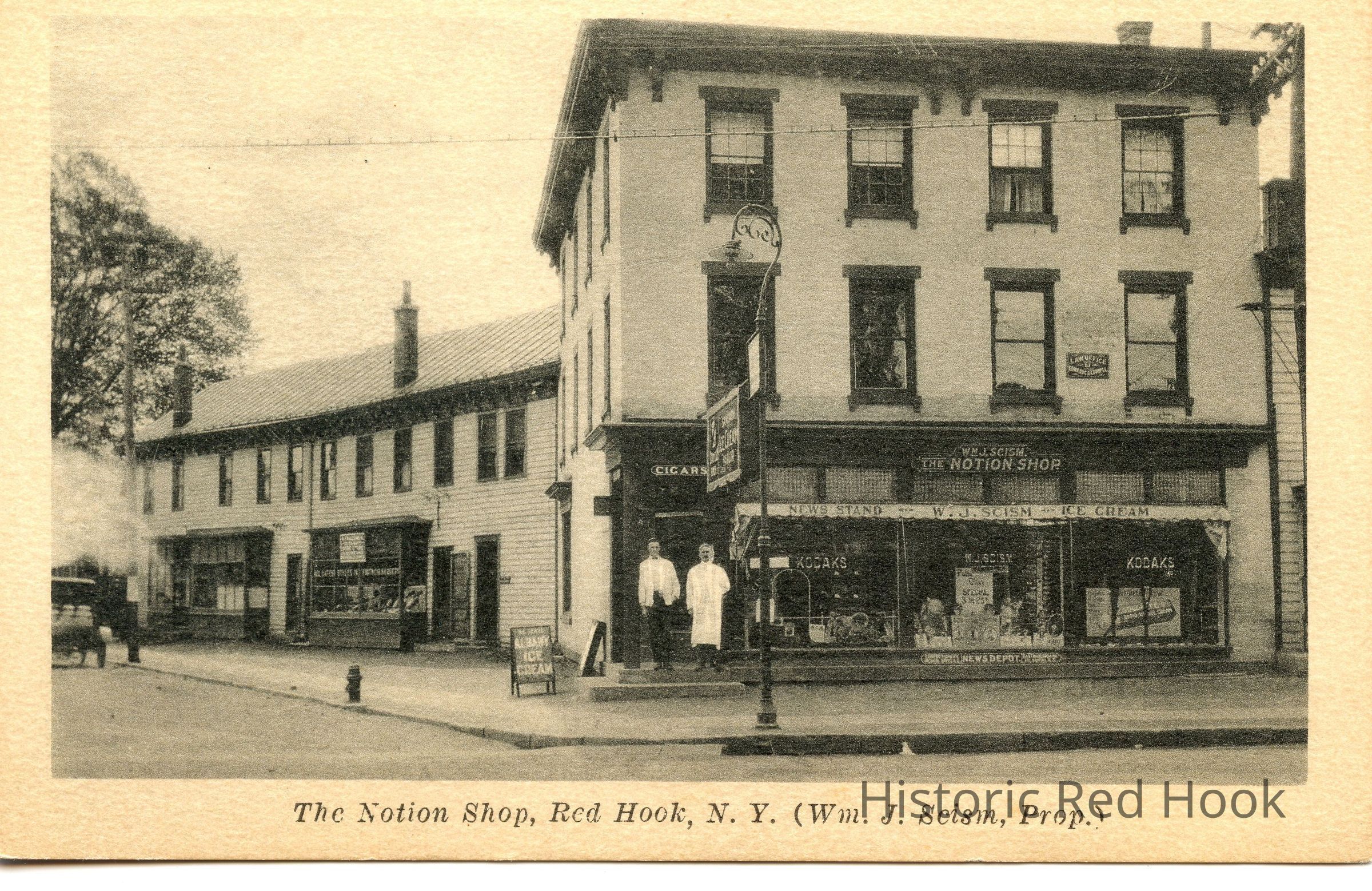 The Notion Shop owned by Wm. J. Scism with signs for cigars, news stand, and ice cream. Two men standing doorway.Subject Person/Organization