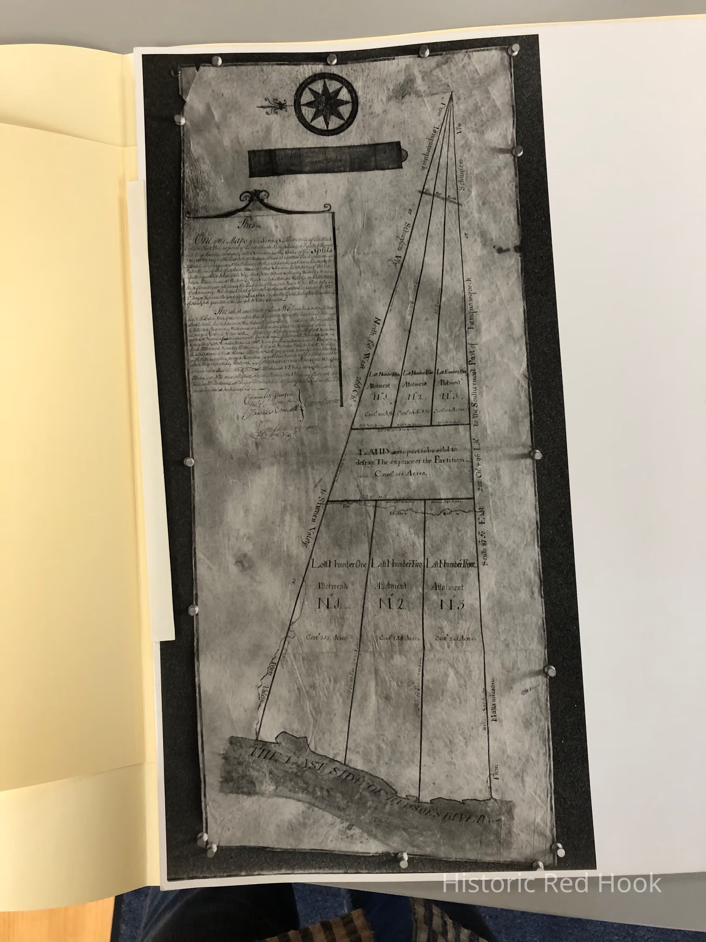 Photostat of Survey map of The Splits between Rhinebeck and Red Hook with accompanying description of the survey. Survey by George Clinton