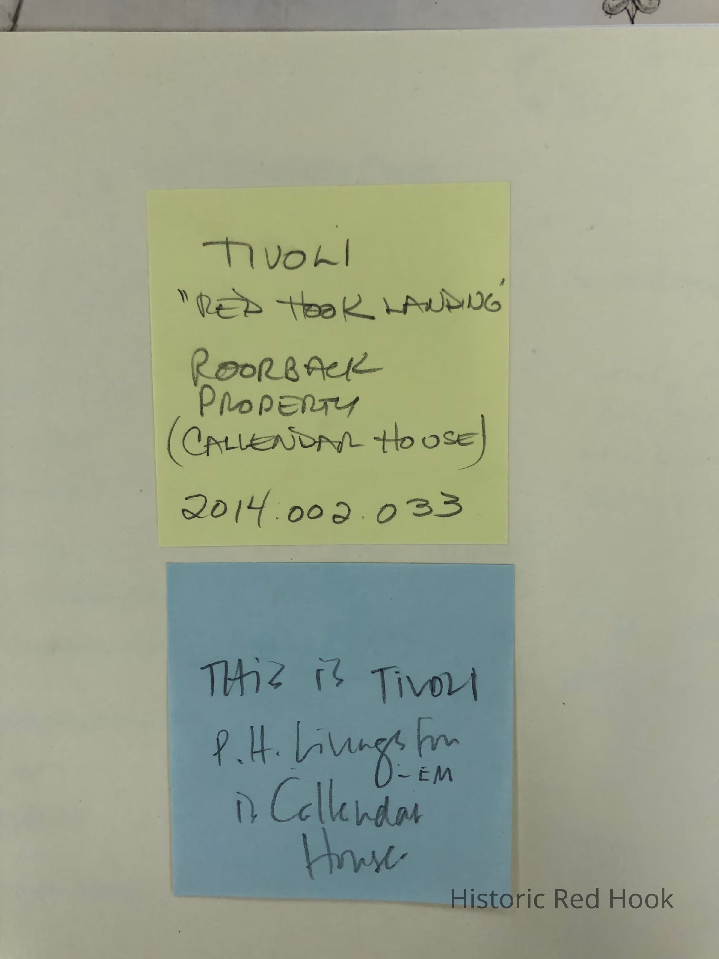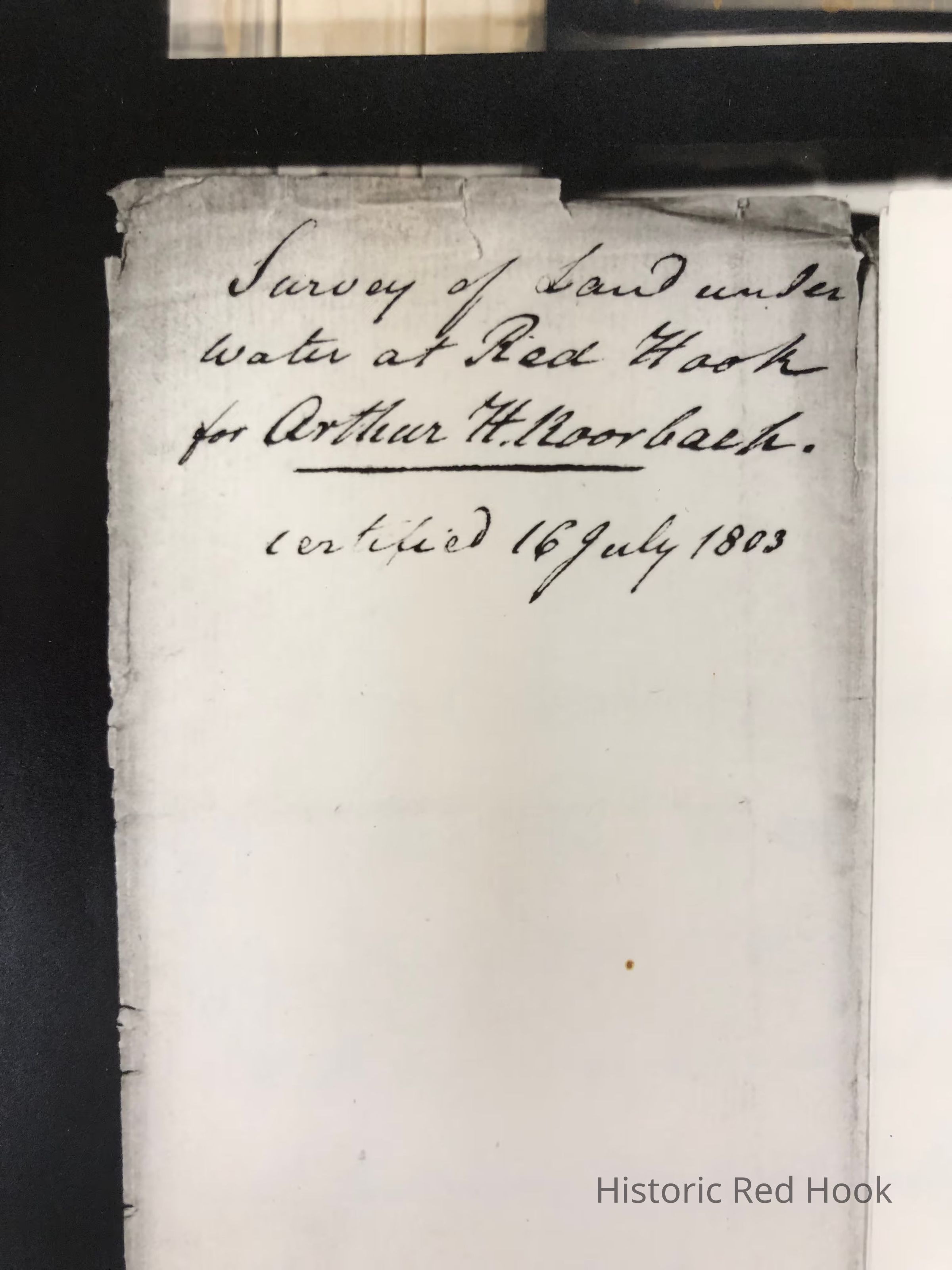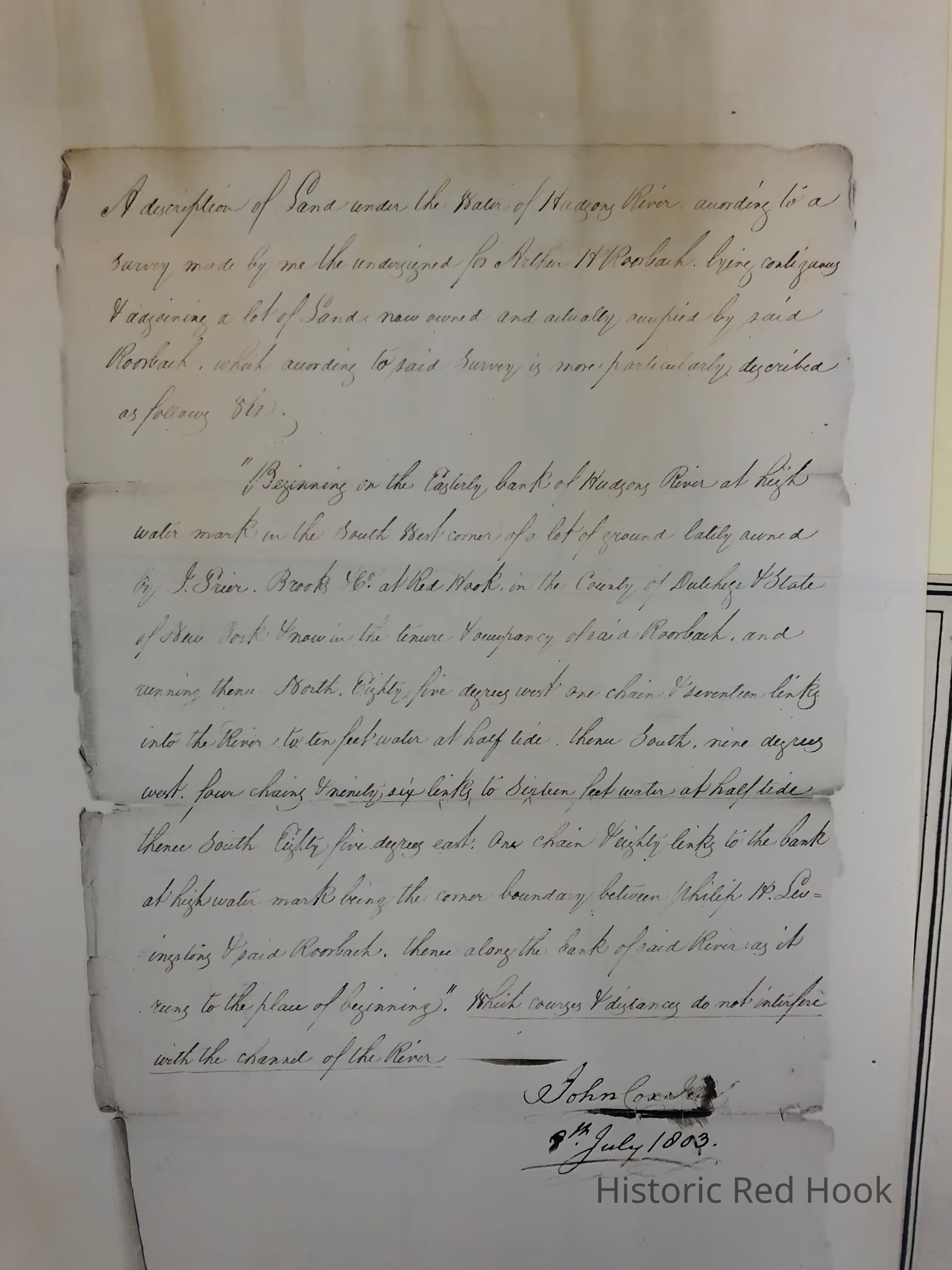 Three page photostat of 1803 Survey of Land and under water lot at Red Hook landing for Arthur H. Roorback by John Cox, scale of one chain to an inch. The third page contains a photostat of a handwritten document describing the land by John Cox dated 1803. Property pictured - site of Callendar House.