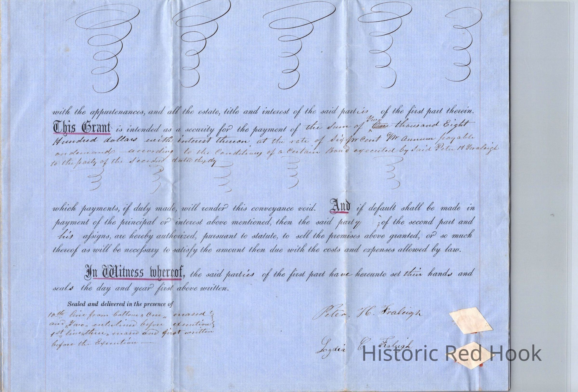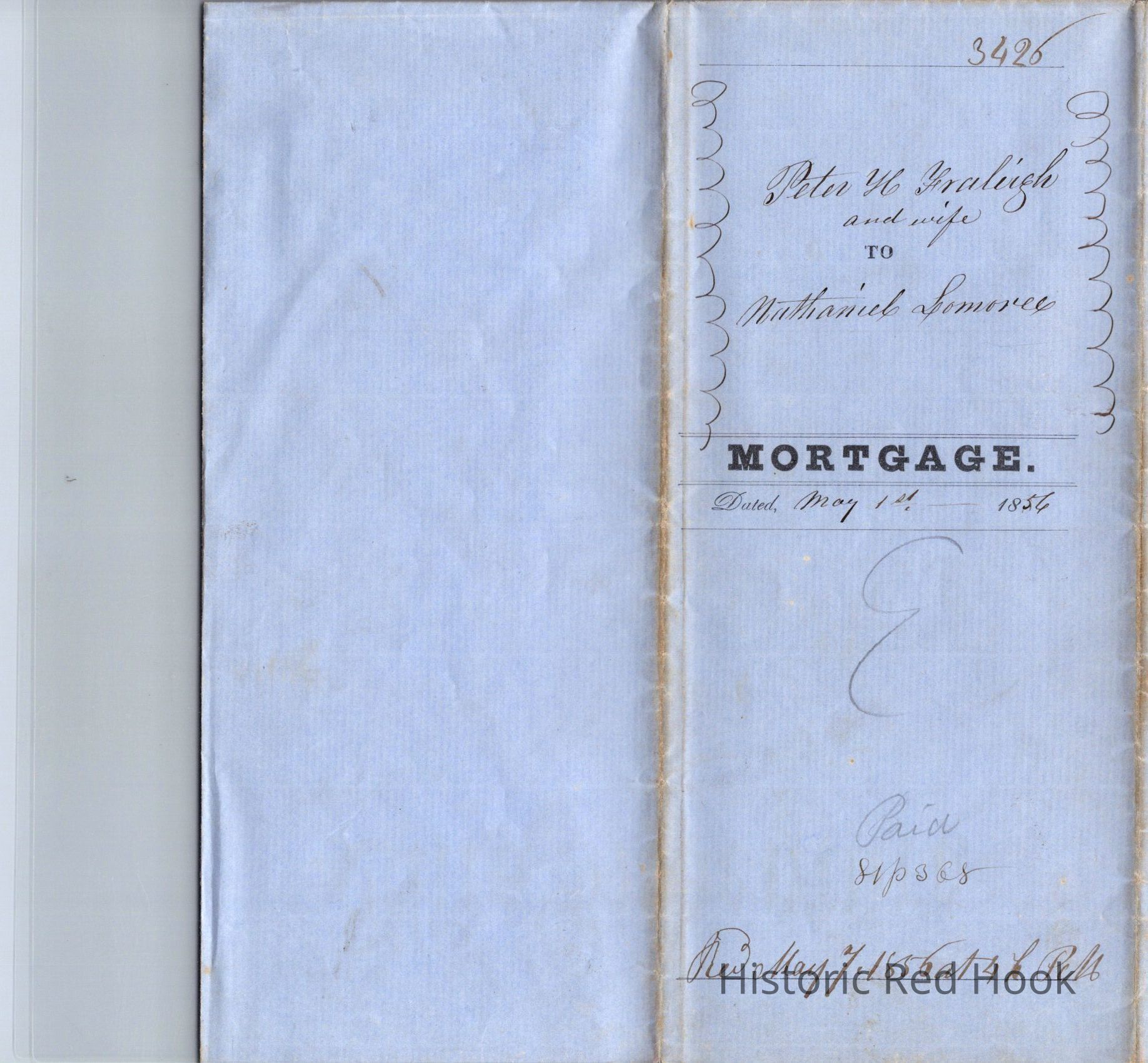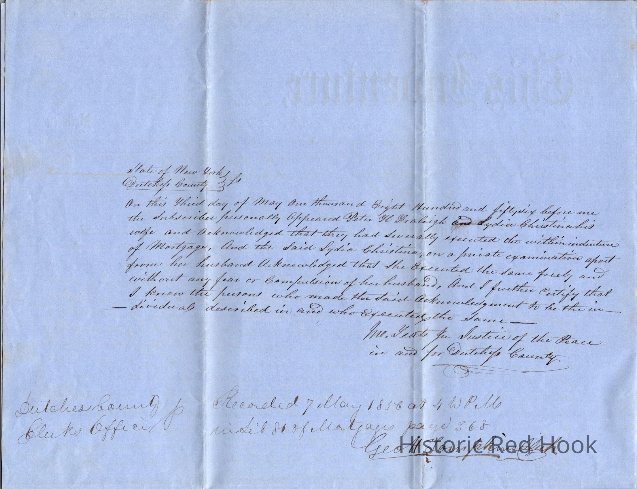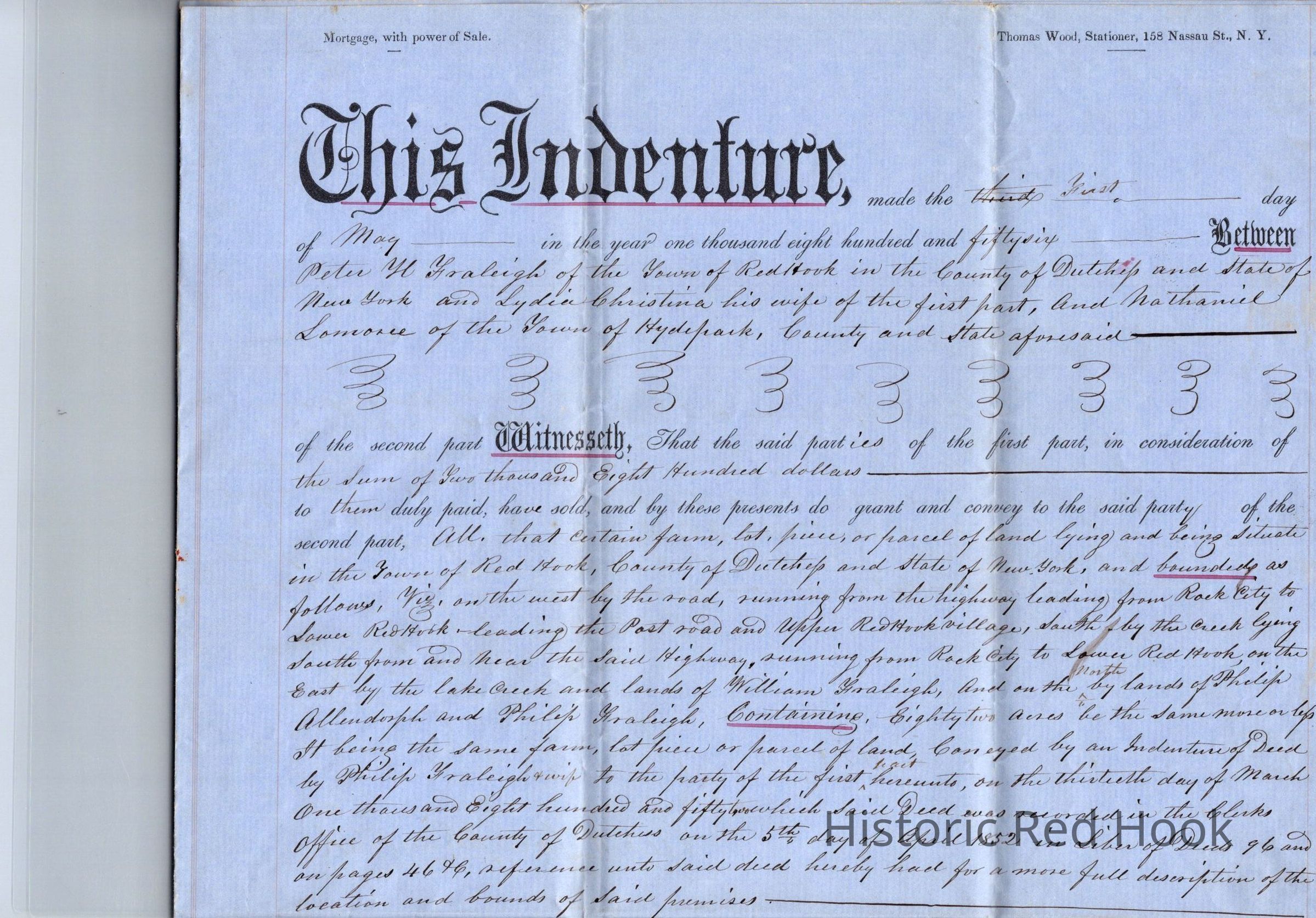 Mortgage to Fraleigh Farm, May 1, 1856, then 82 acres. Peter H. Fraleigh & Lydia, his wife, to Nathaniel Lomoree (?) $2,800 at 6% interest.Relationships