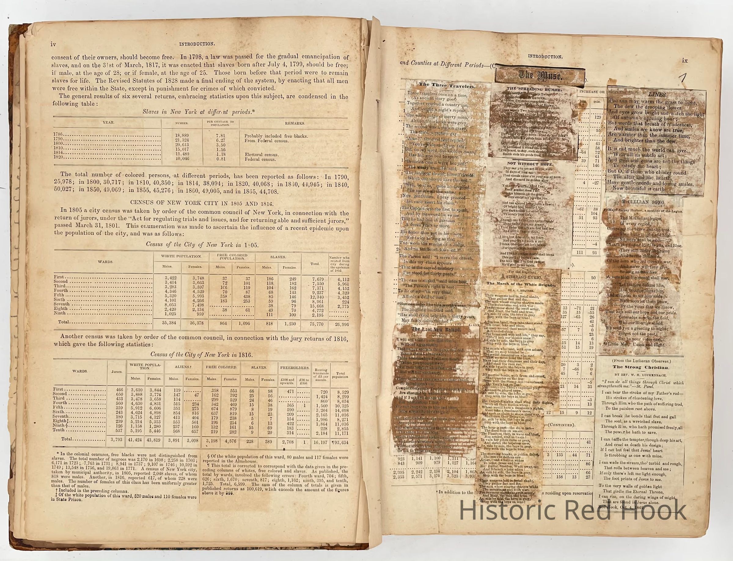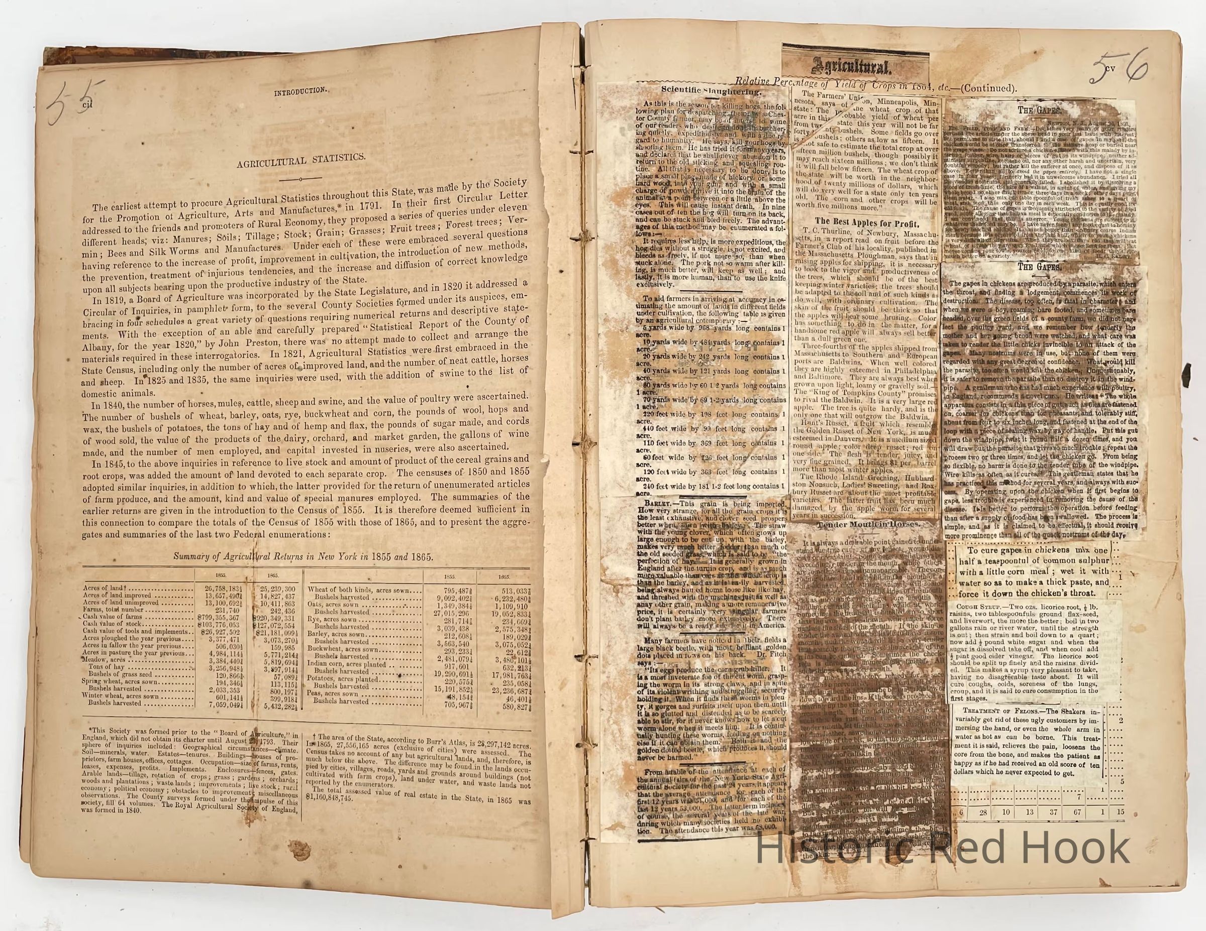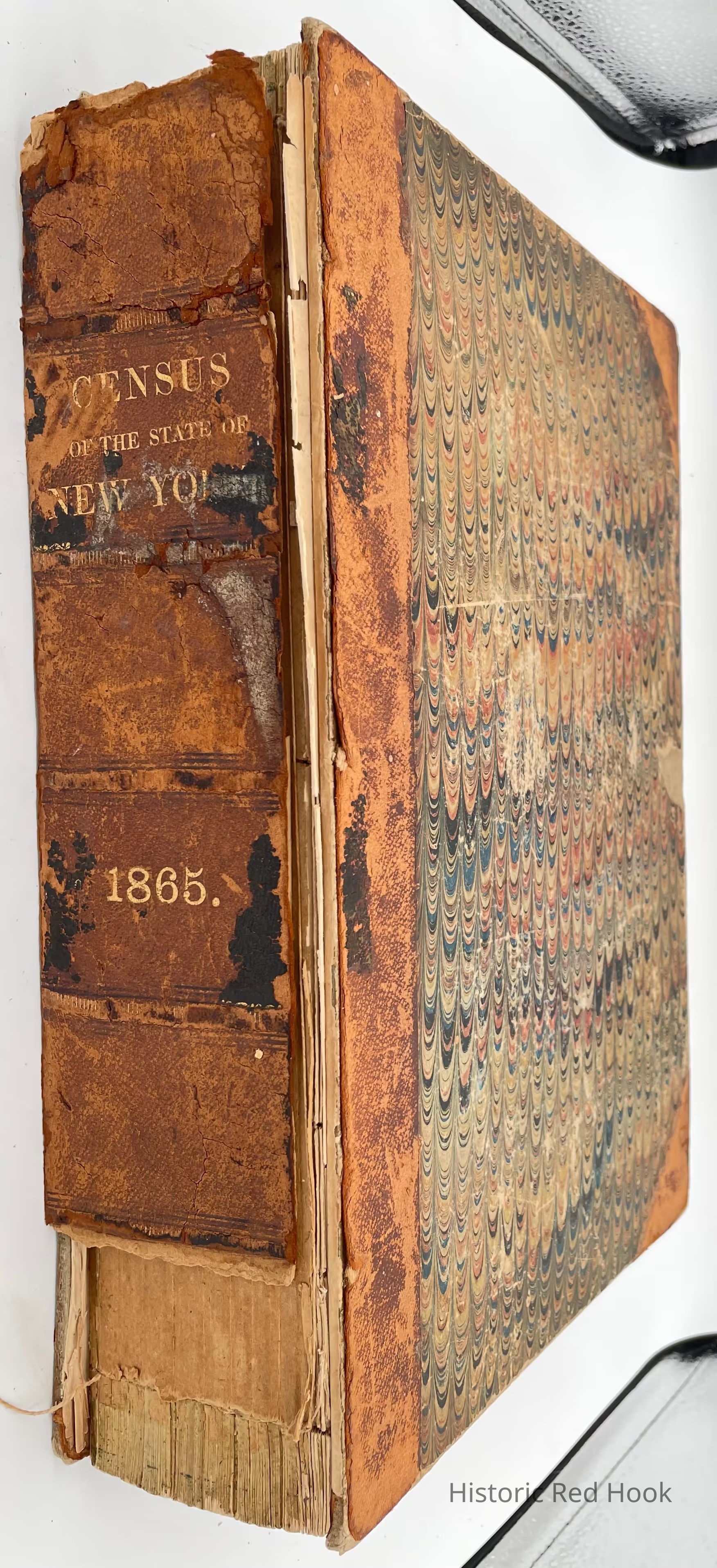 1865 NYS Census book owned by Jacob W. Elseffer and used as a scrapbook, likely by another member of the Elseffer family. The inside front cover is inscribed as follows" "J. W. Elseffer, Esq. Respects of Chauncey Akud (?)". Pasted on inside of back cover is a label "Farmers Bank of Hudson, Oct 3, 1862" and a Ten Cents note issued by the Corporation of the City of Albany, Nov 24, 1862.Collection