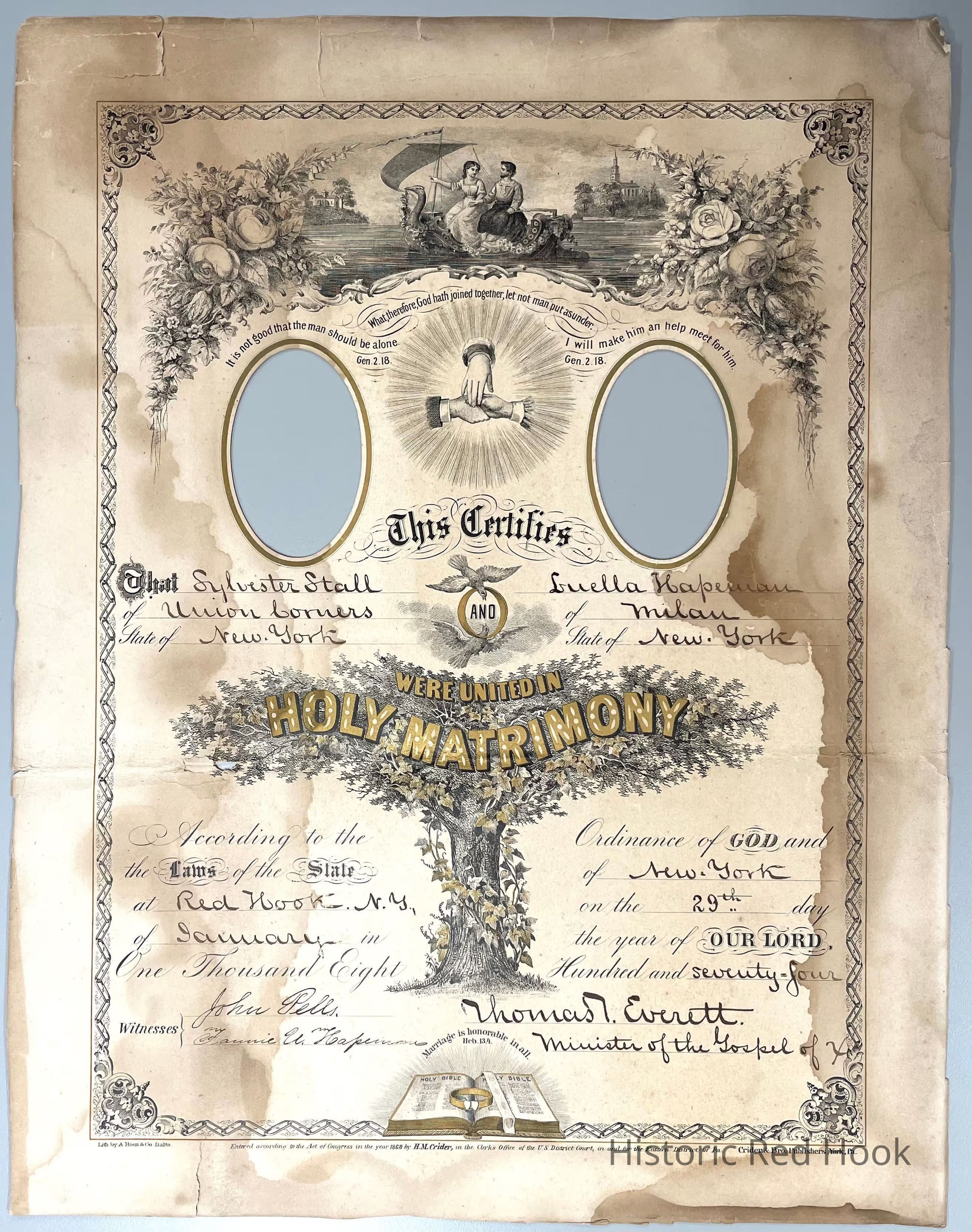 1874, Marriage Cert. Sylvester Stall, Union Corners & Luella Hapeman, MilanCollection