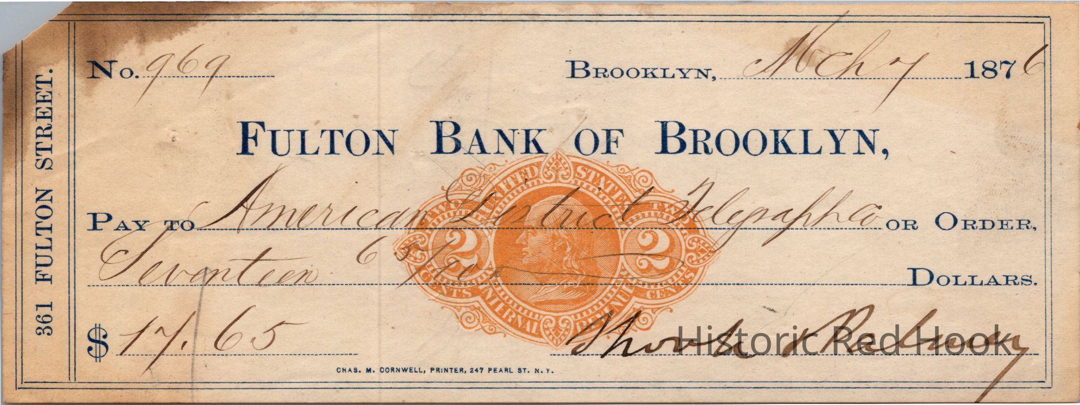 Check to American District Telegraph from ?????? Palmer drawn on the Fulton Bank of Brooklyn. 1876Collection