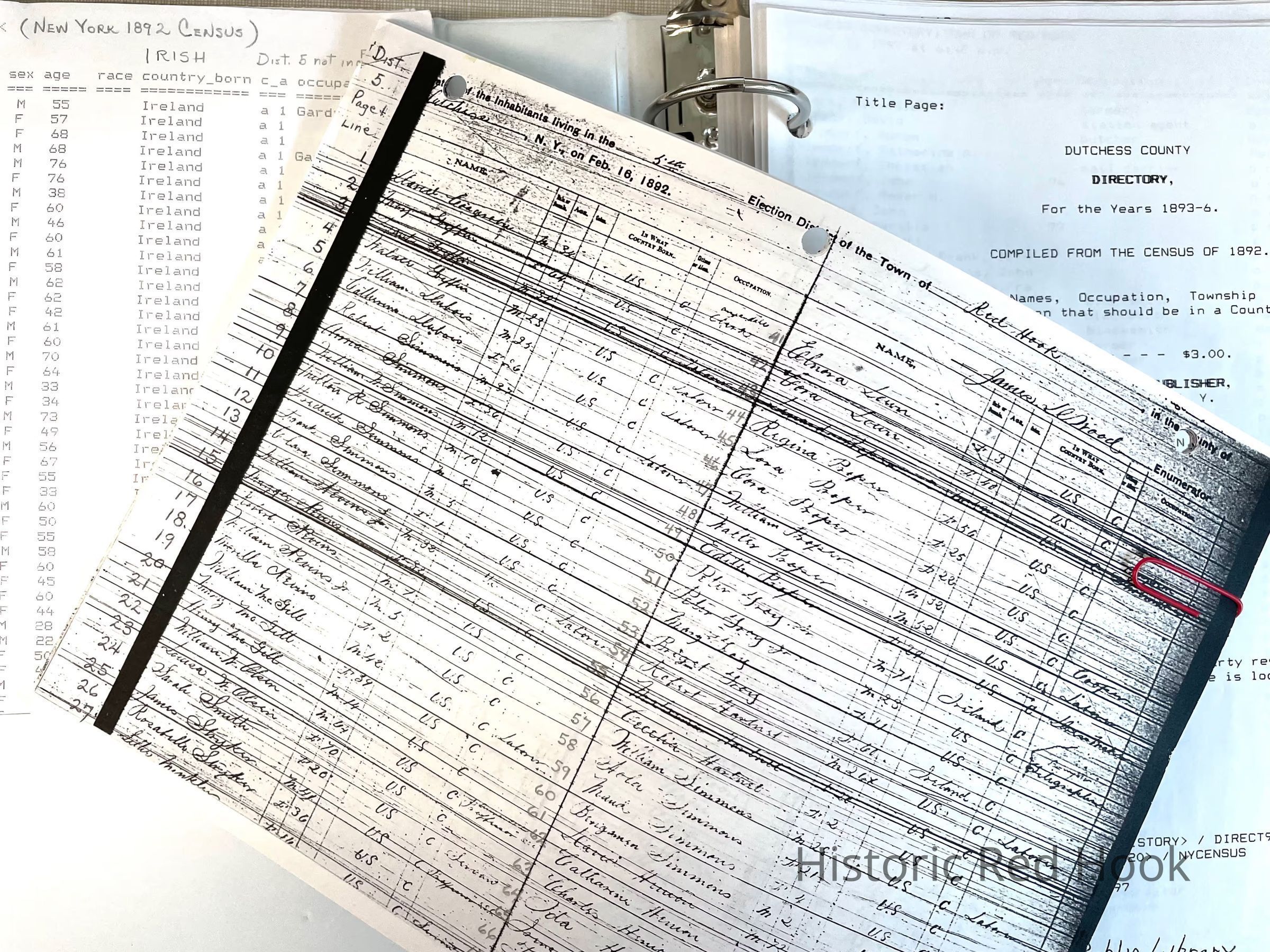 Census data and Index to the 1892 State Census for town of Red Hook. Indices and Photo copies are in the Notebook