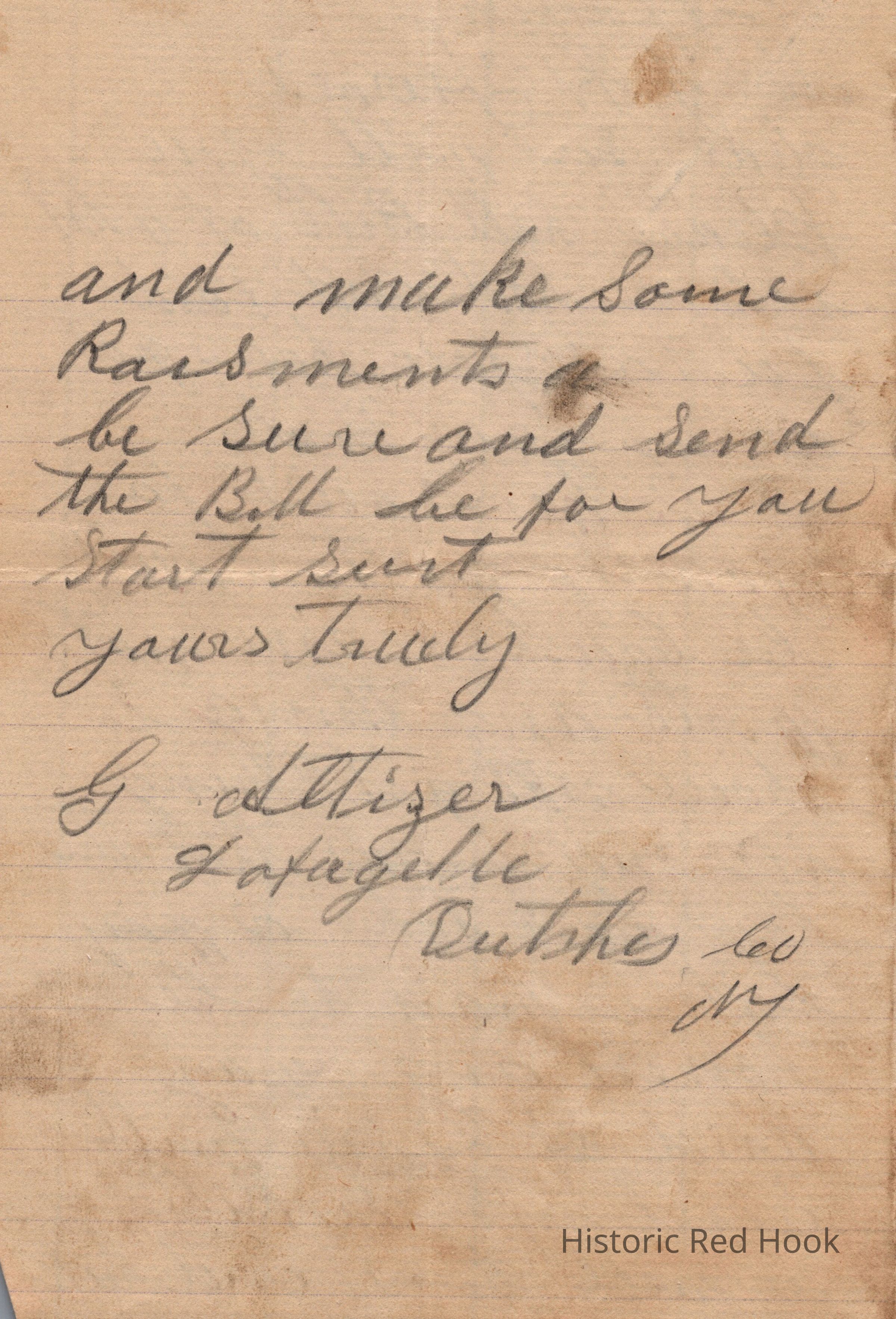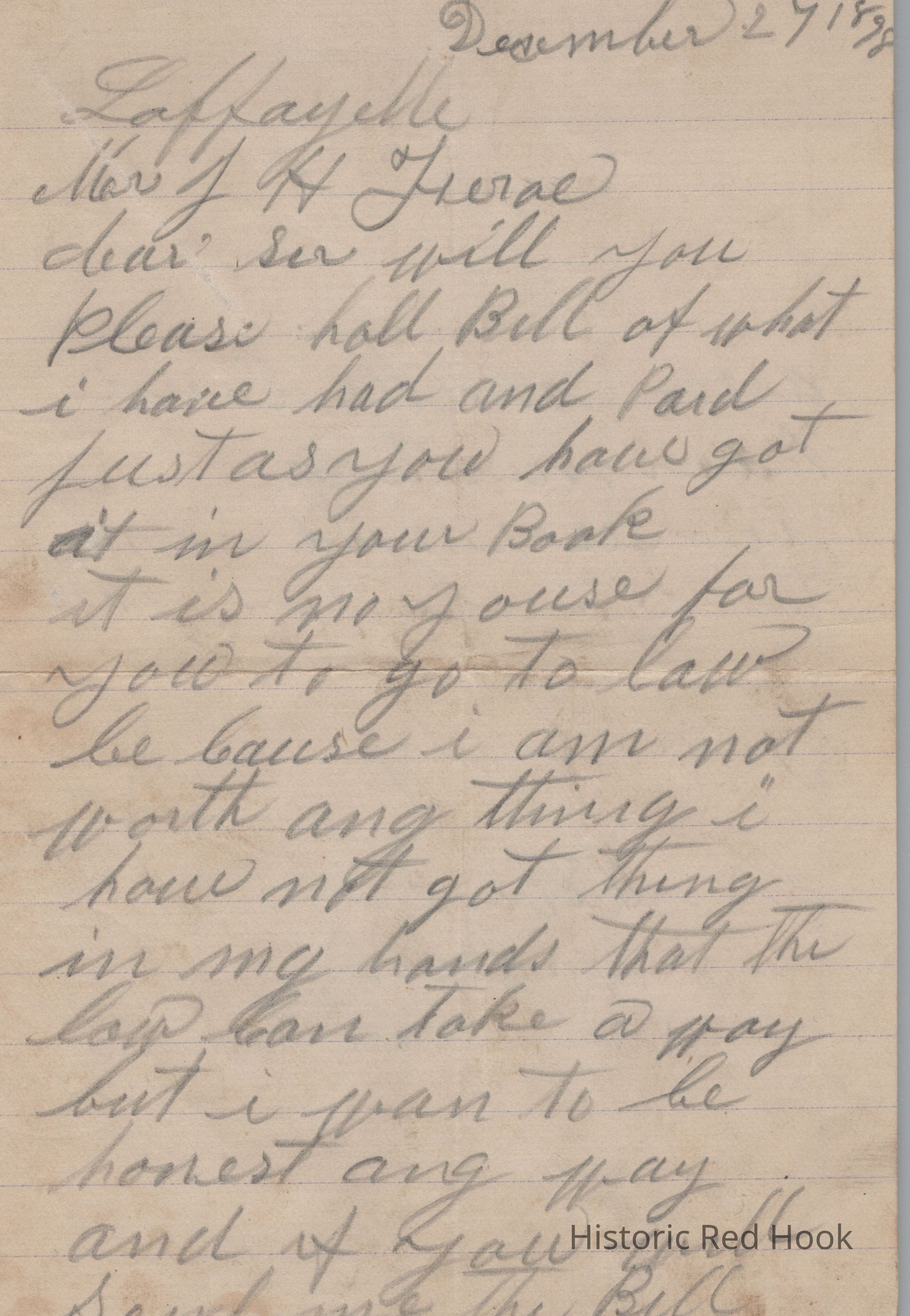 A letter from Geo. Altizer of Lafayette requesting a detailed bill for an overdue account with a promise for payment to Mr. J.H. Feroe Tivoli Dutchess Co. NY, dated December 27, 1898.