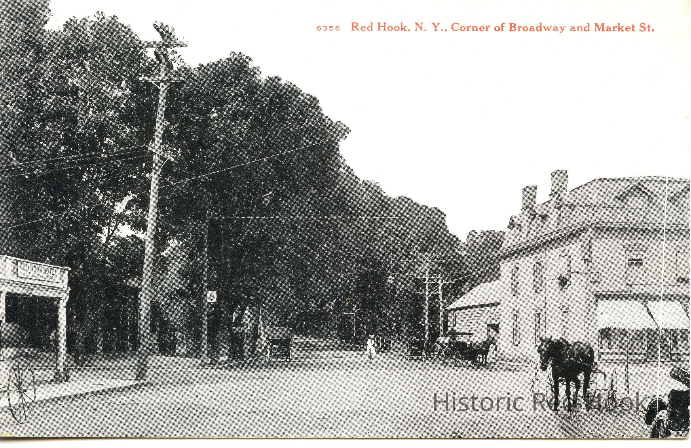Postcard image of Red Hook Village intersection, looking north up Broadway with the Conklin & Allendorf Building on the right, a corner of the Red Hook Hotel on the left and horse-drawn carriages in the road, c. 1900.Subject Place