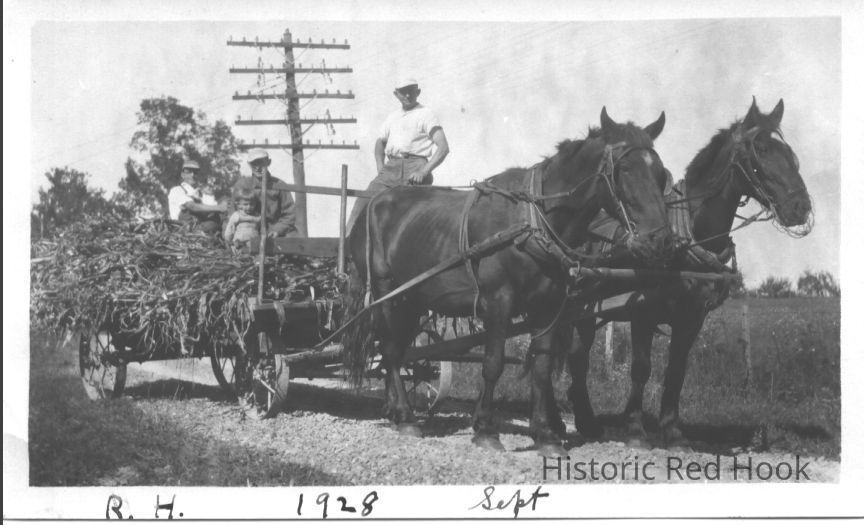 Horse drawn wagon pictured in September, 1928 at the Vogel Farm in Red Hook, New York. Walter Vogel standing in white shirt.Photograph Details