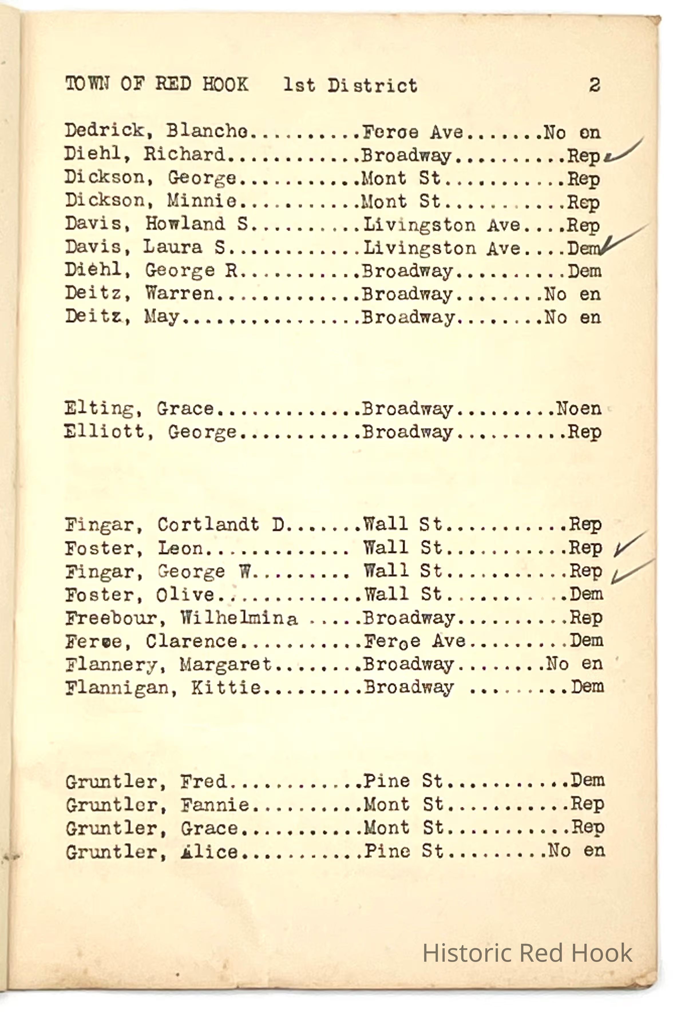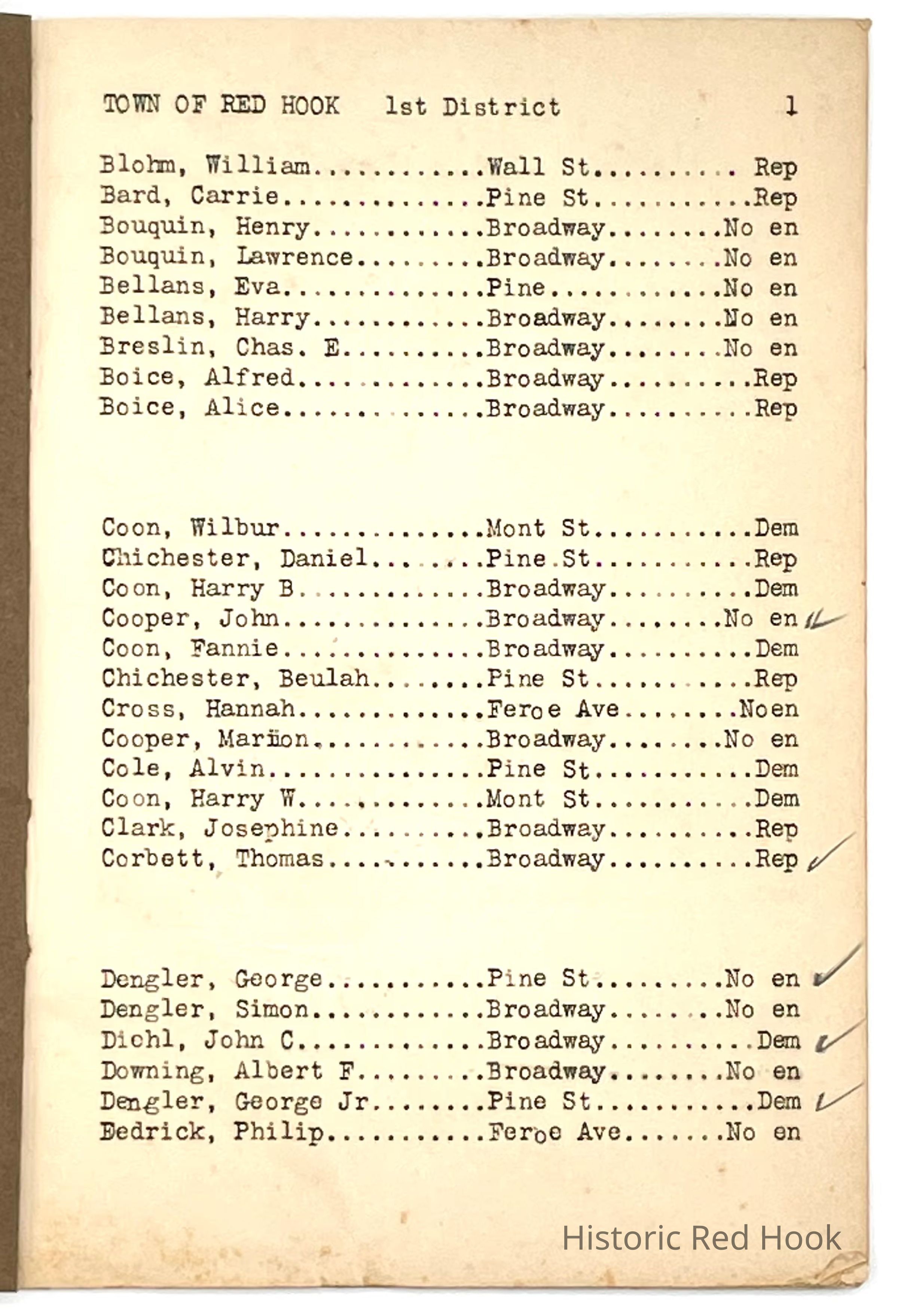 Listing of all the voters, with their affiliations, in Red Hook's First District