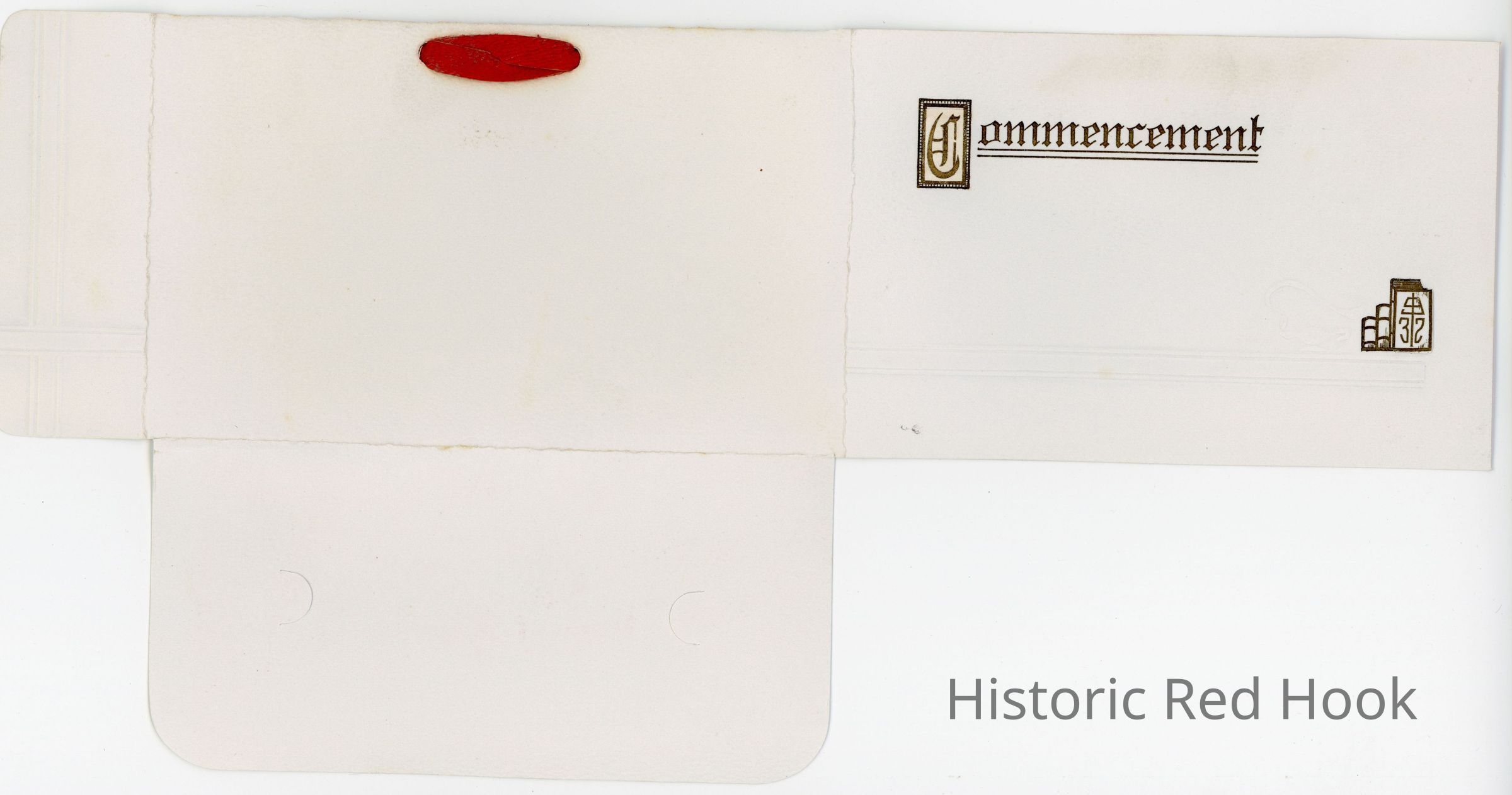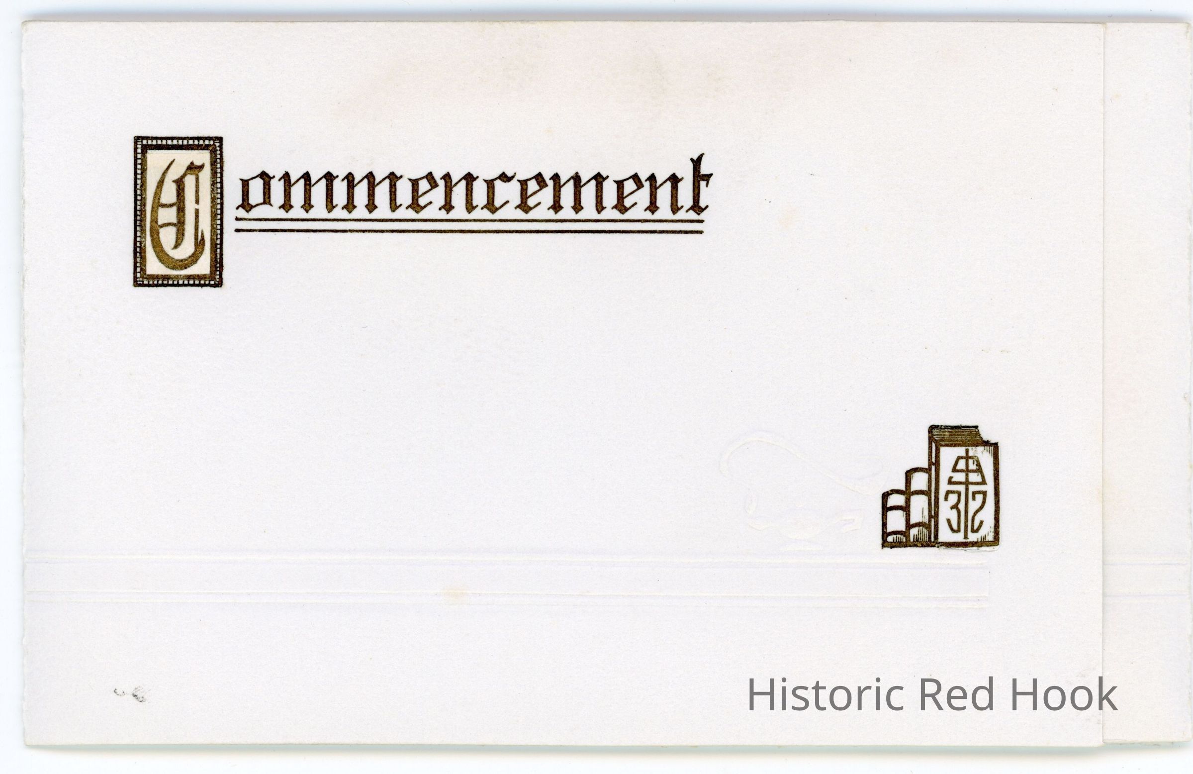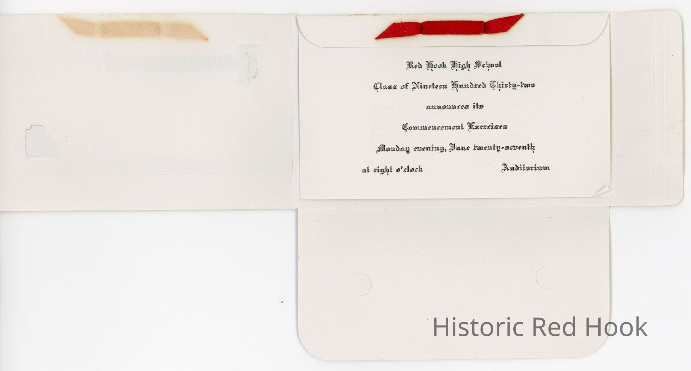 Invitation for The Class of 1932 Commencement Exercise to be held on Monday evening, June 27th at eight o'clock. The invitation announcement included the names of the graduates as well as the class colors: red and white, class flower: rose, and the class motto: knowledge is power,Relationships