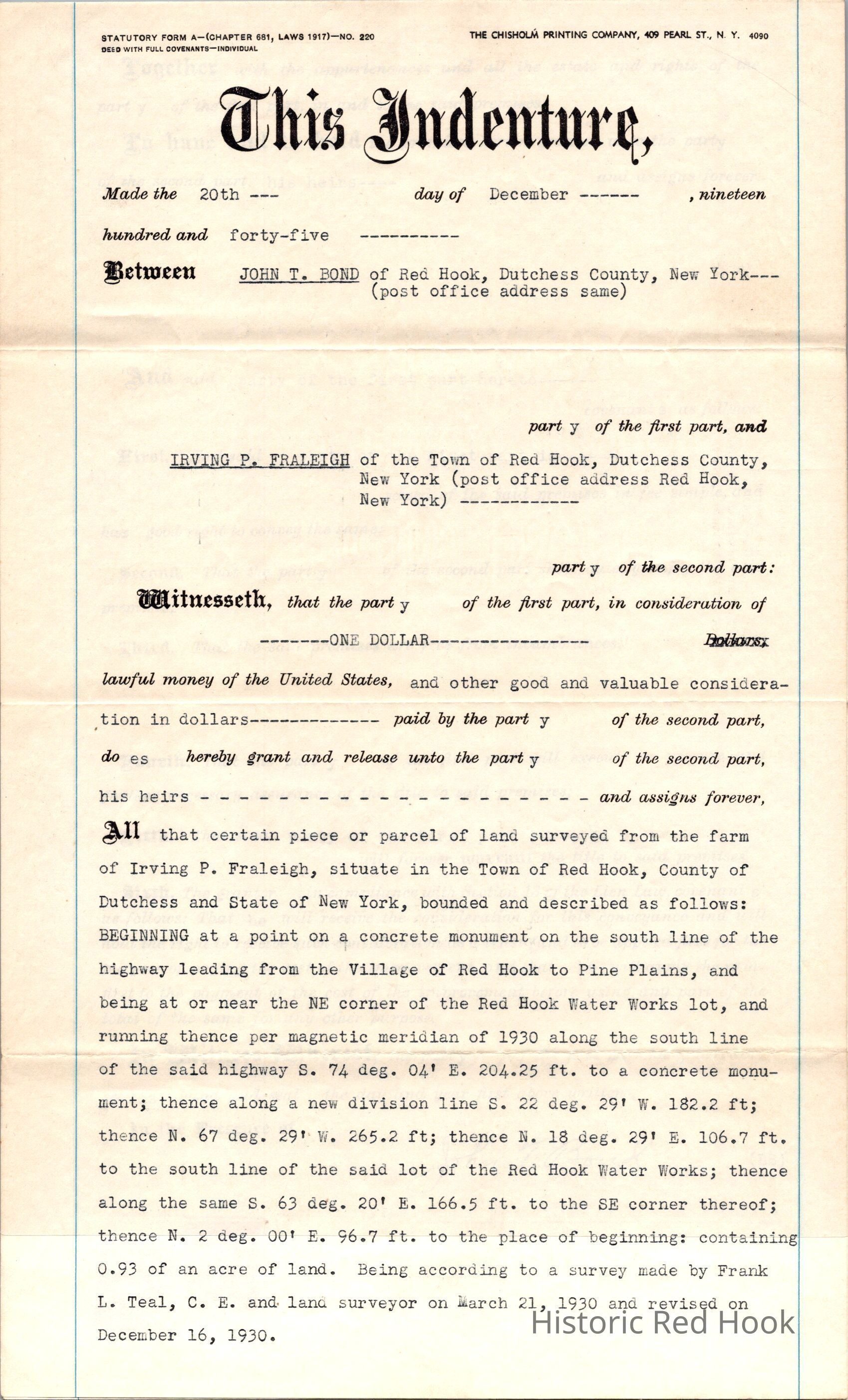 1945 Deed John T. Bond to Irving P. Fraleigh for .93 acres of land.Relationships