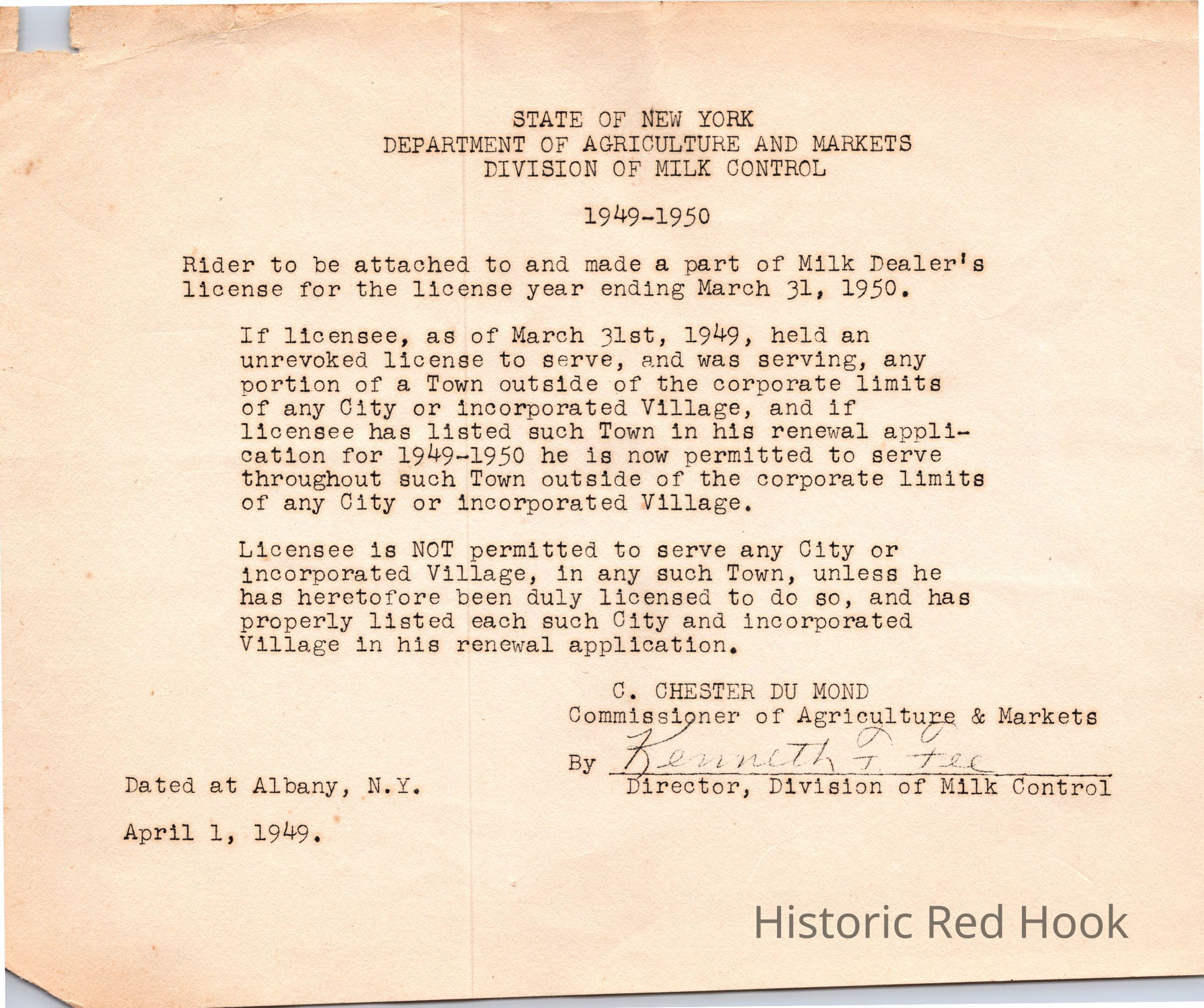 Rider attached to Teator Dairy License from 1949Subject Person/Organization