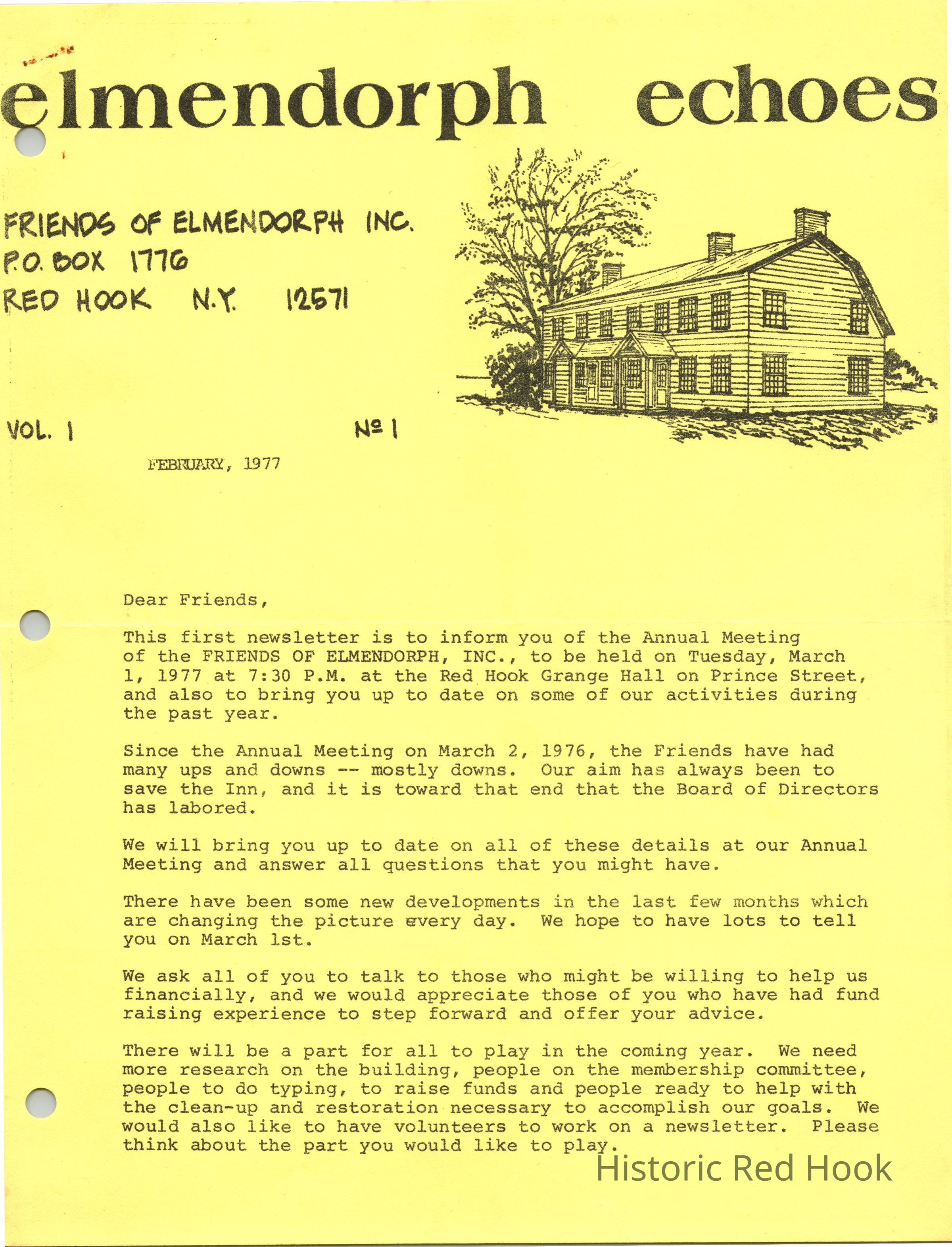 Newsletter created for the membership of the Friends of the Elmendorph.