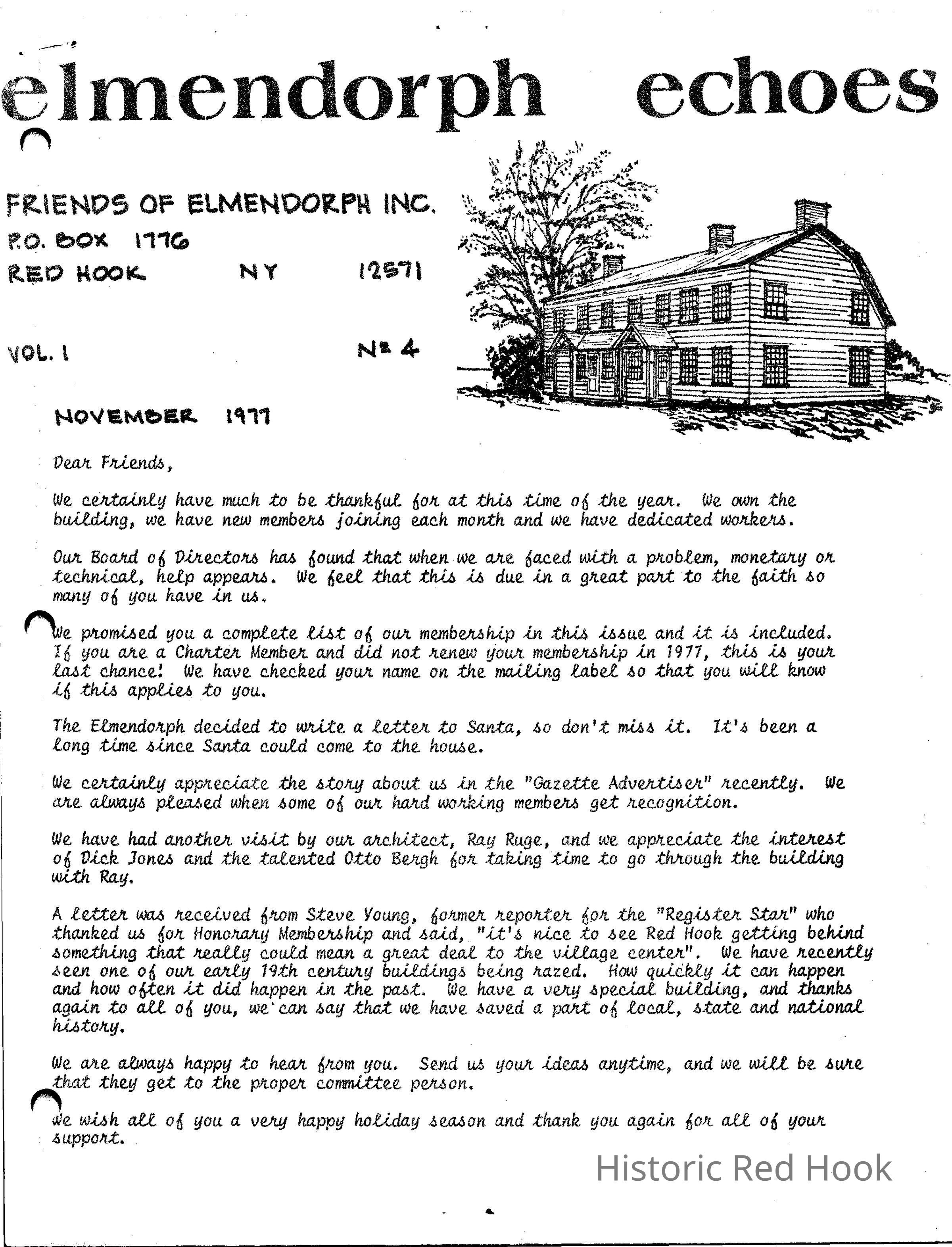 Newsletter created for the membership of the Friends of the Elmendorph.