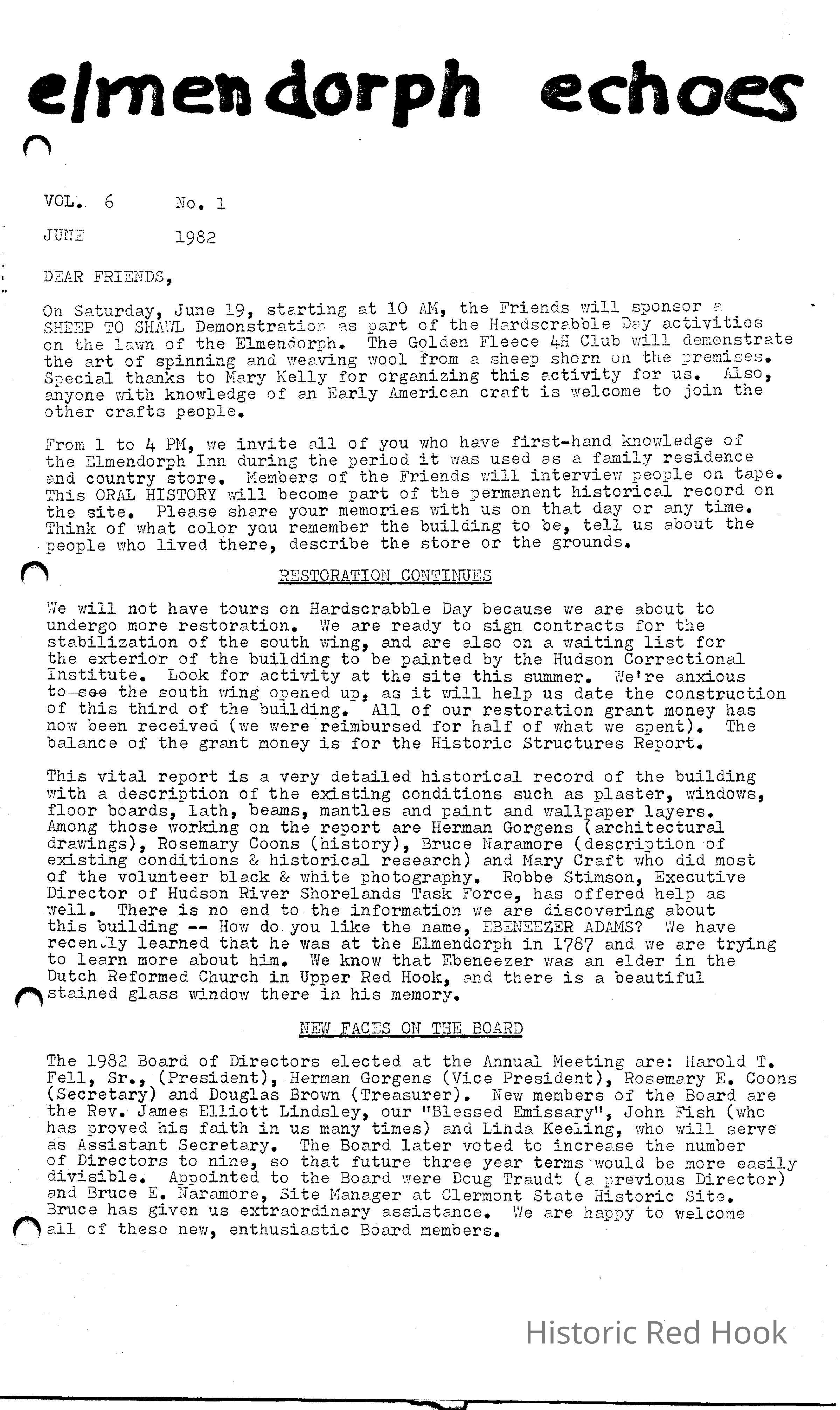 Newsletter created for the membership of the Friends of the Elmendorph.