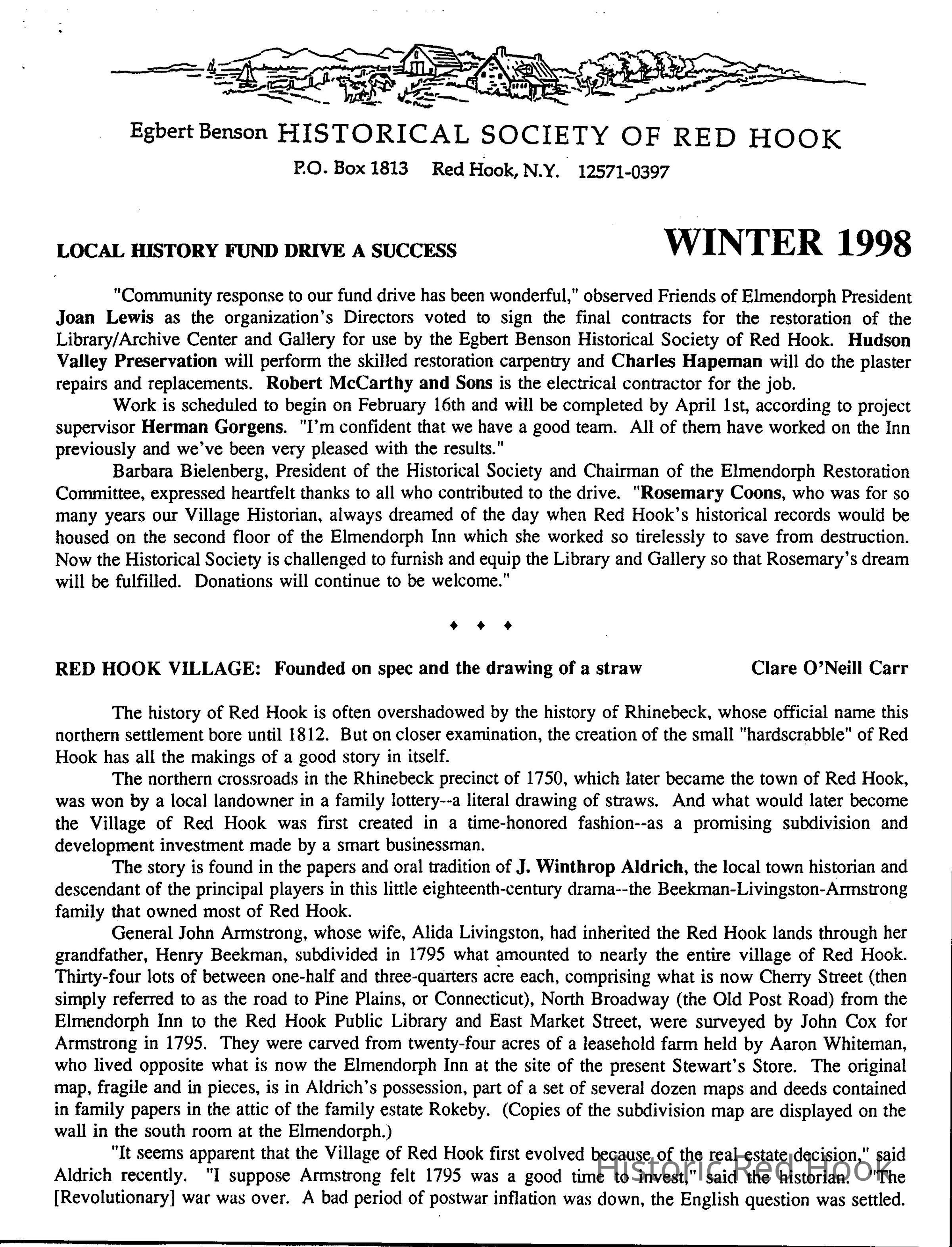 News letter published by The Egbert Benson Historical Society of Red Hook. Winter 1998