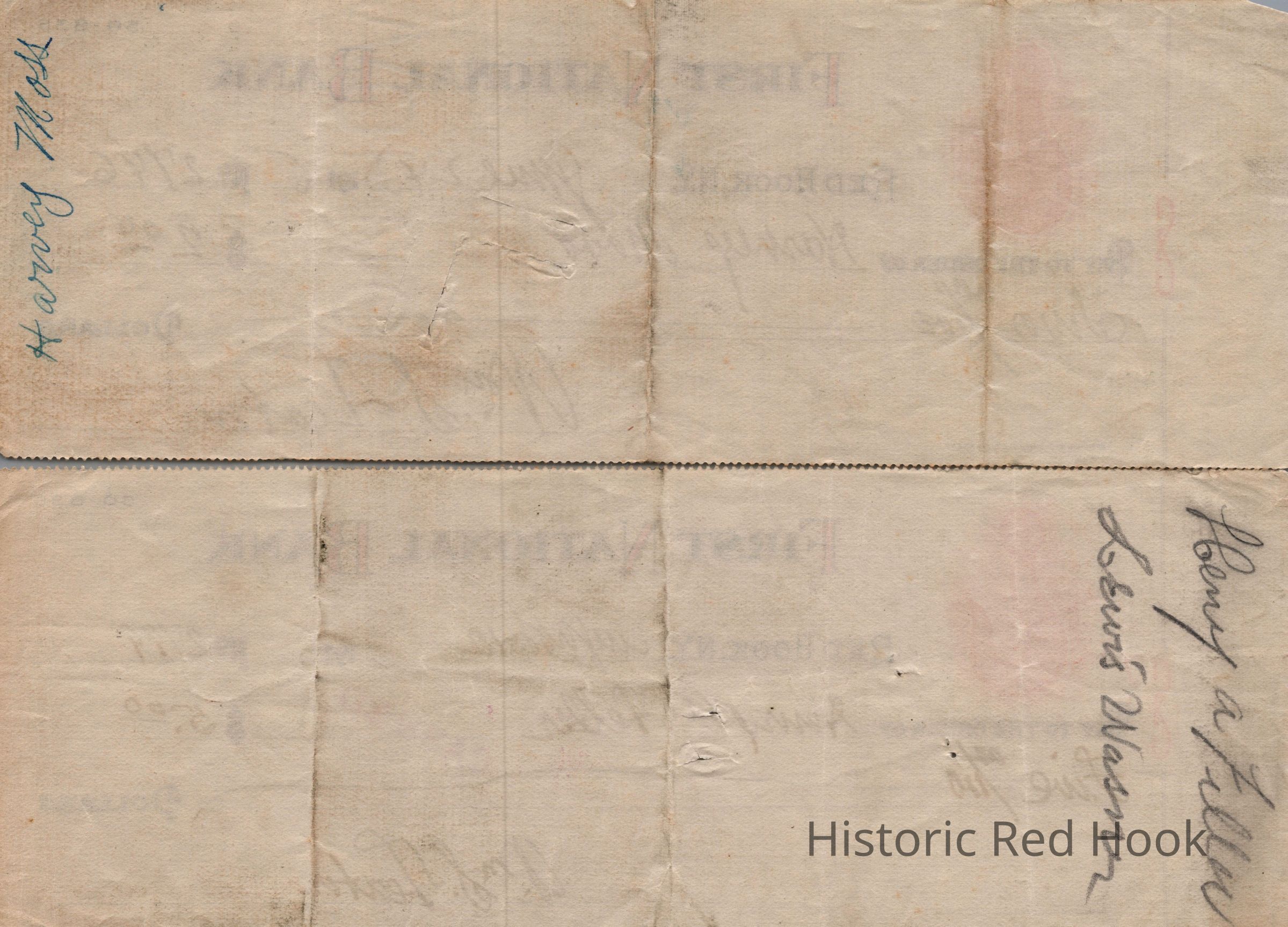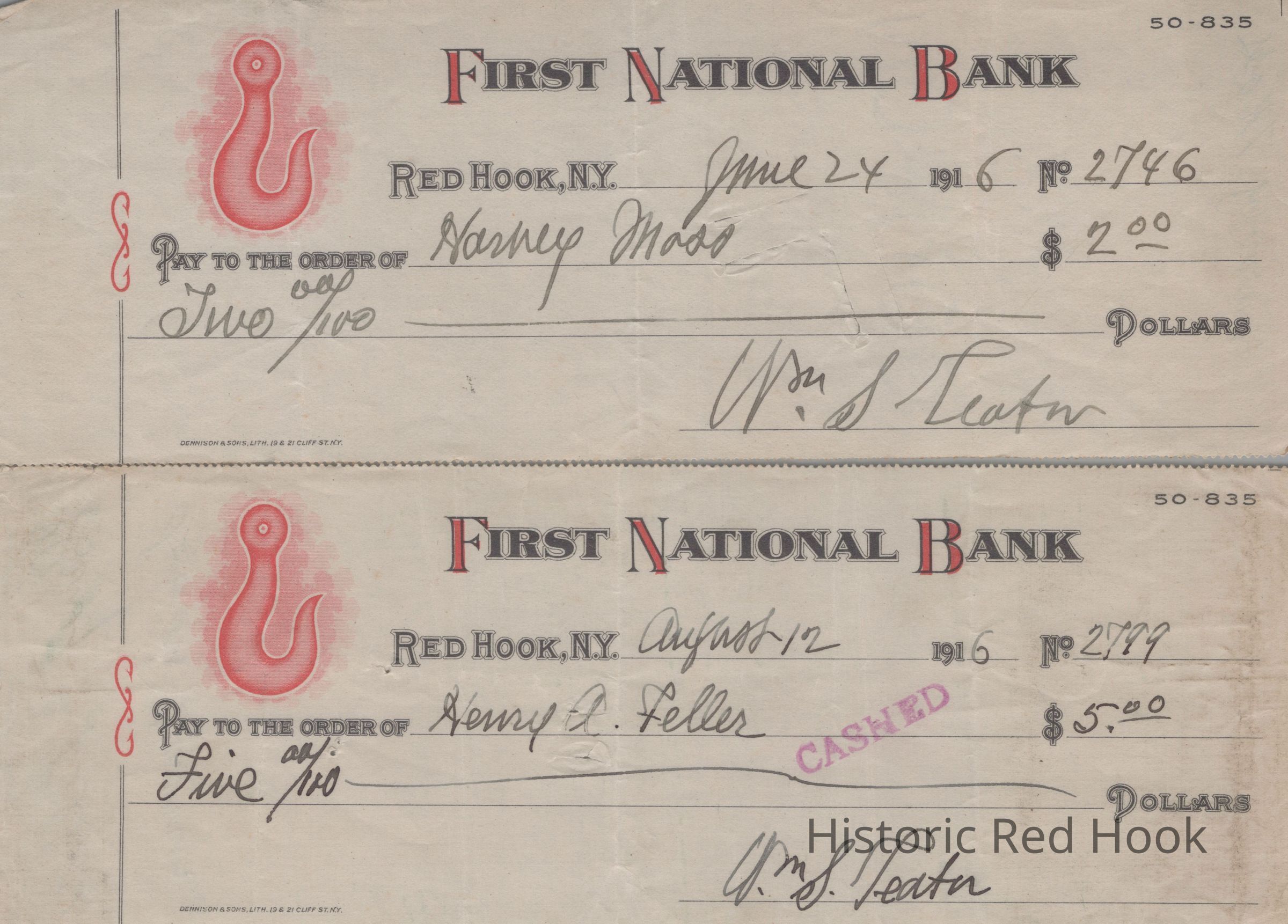 Two First National Bank of Red Hook Checks written by Wm. S. Teator in 1916 made out to Harvey Moss and Henry A. Feller.Relationships