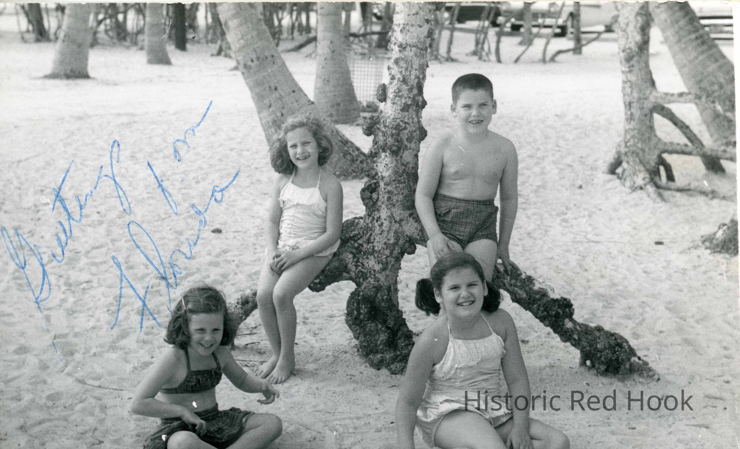 Picture postcard featuring a group of four children sitting on the beach near a tree in swimsuits identified as Henry Abrahams children. Greetings from Florida written across the photo with Hi Clara - Merry Xmas! - belatedly, Lola written on the back. The card has been addressed to Mrs. John Losee Rte 199 Rock City, Red Hook (Rhinebeck having been crossed out) NYPhotograph Details