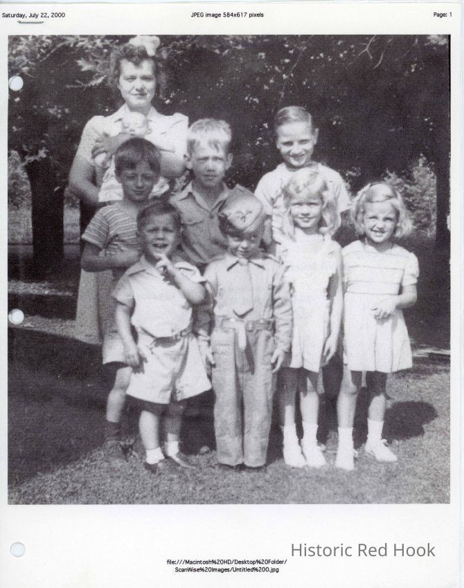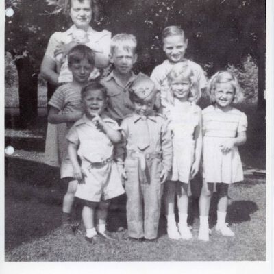 Outdoor group posed photo of a woman holding an infant with seven other children identified as follows from back to front, left to right: Kay Ham holding Phyllis Ham; Charlie Coon; Greg Hile; Jack Coon; Barry Millus; Maynar Hams 4th Birthday Party July 18, 1940; Connie Hyde; Sue Crane