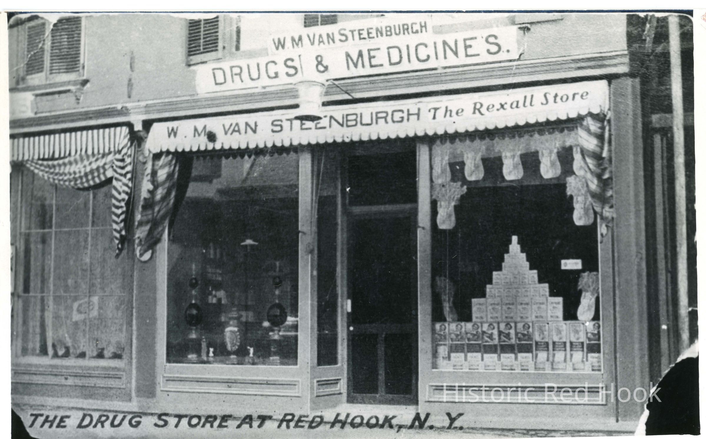 Postcard view of W. M. Van Steenburgh's Drug Store "The Rexall Store" in the Conklin & Allendorf Building, c. 1900Subject Person/Organization