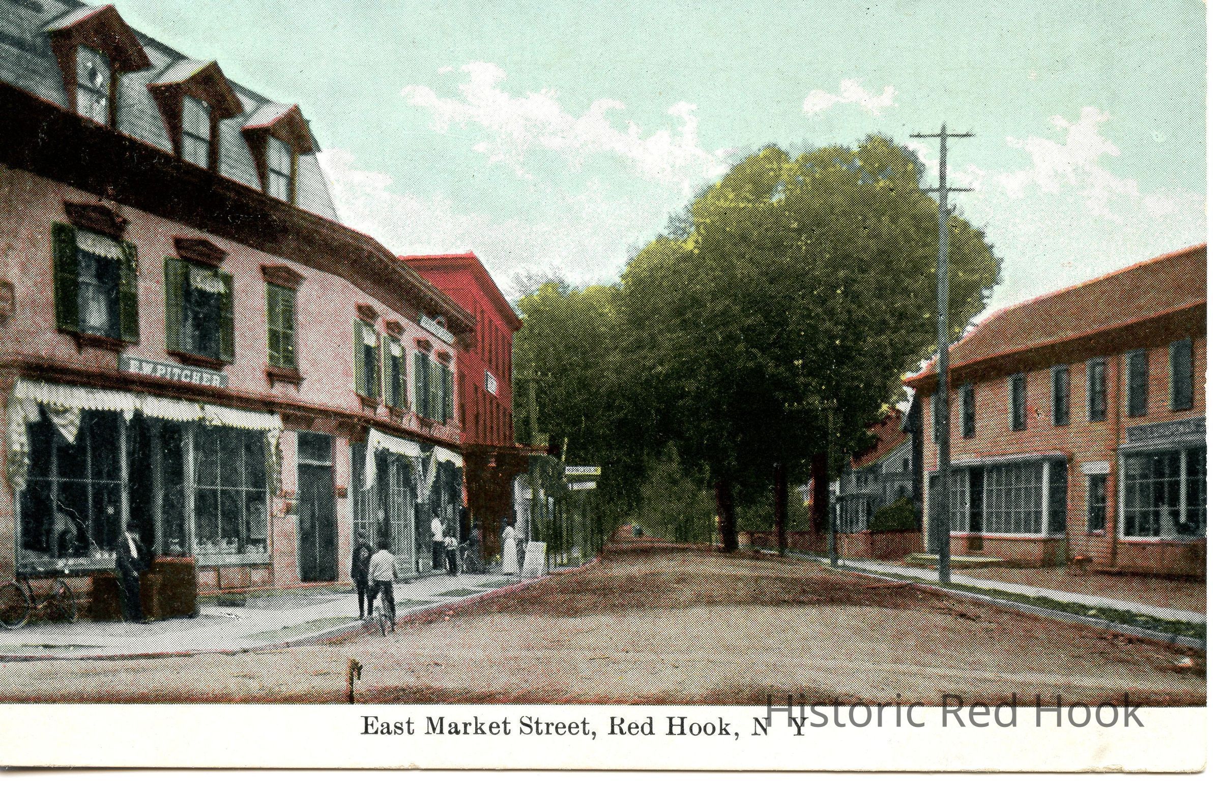 Colorized postcard view looking east on East Market Street, showing a sign for E. W. Pitcher's business in the Conklin & Allendorf building, early 20th centurySubject Person/Organization