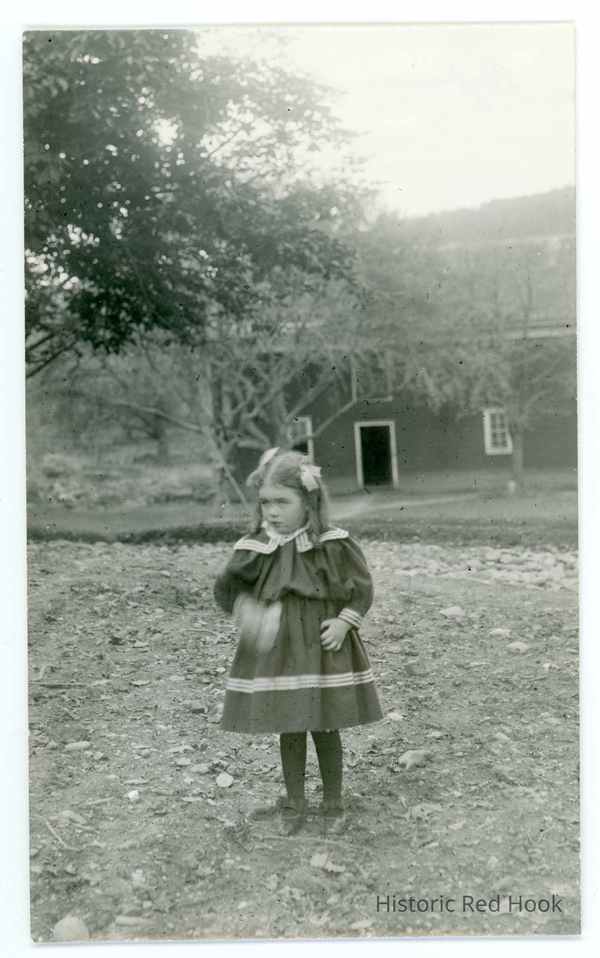 Photograph of a young girl posed outdoors across from a building identified as Dykeman girl.Photograph Details