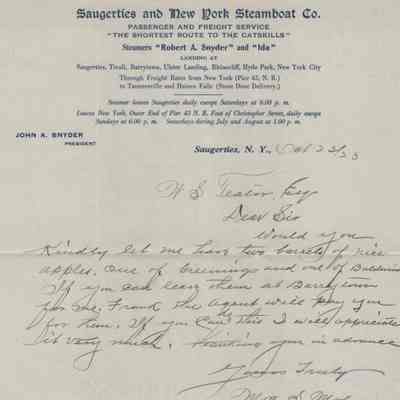 Note from Matt Moloney, clerk of the R. A. Snyder steamer of the Saugerties and New York Steamboat Co., dated October 23, 1923 to William S. Teator requesting a barrel of 'Greenings' and one of 'Baldwins' (types of apples) to be left at the dock at Barrytown where Frank the agent would pay him for them.Relationships
