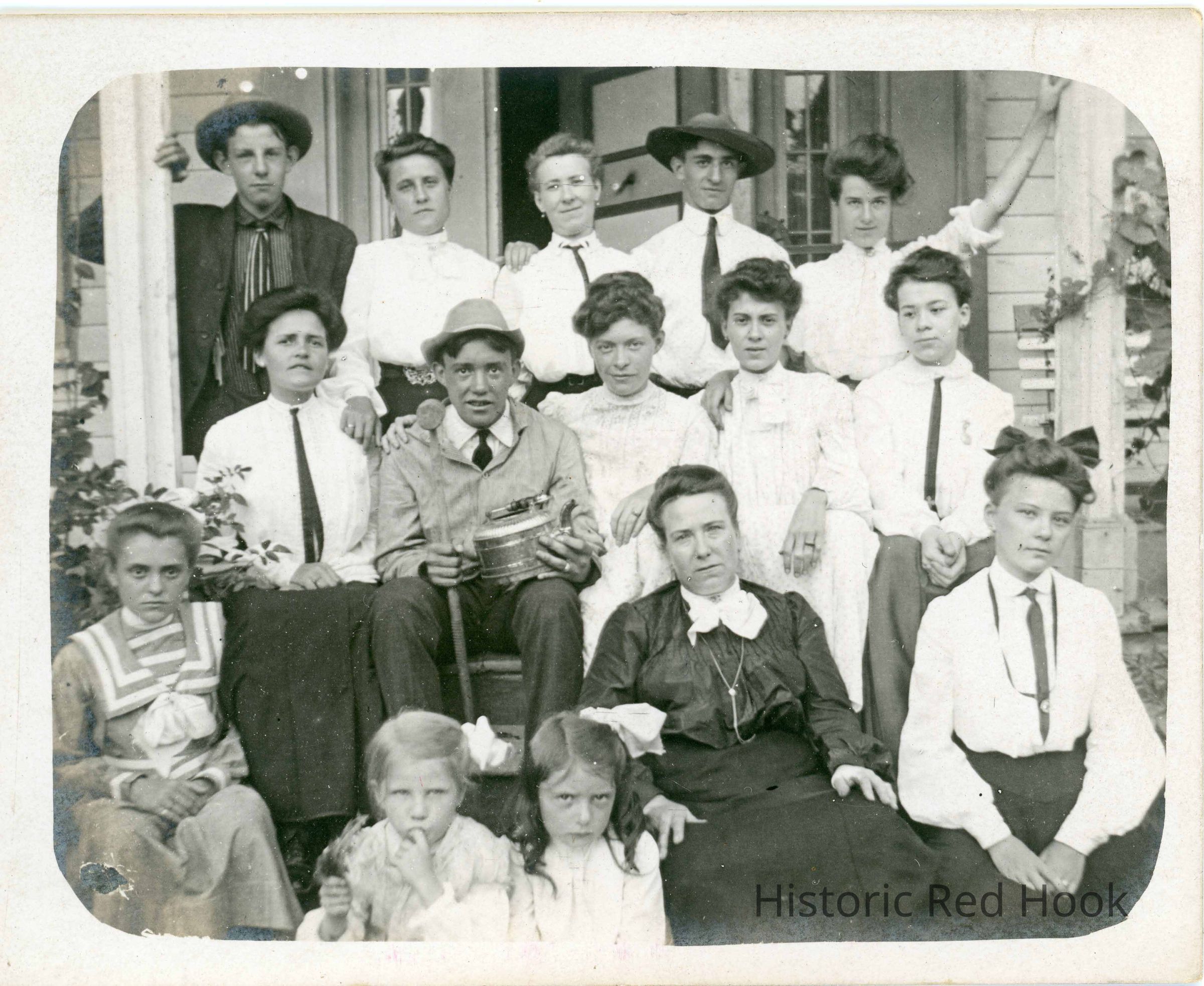 Group photograph of young men, women and children posed seated and standing outside on a porch between two columns.