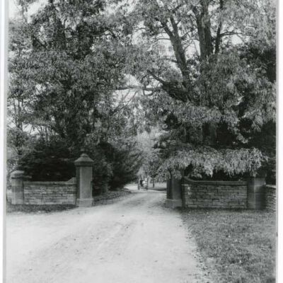 Entrance to river estate (Massena?) with horse and buggy approaching in driveway.
