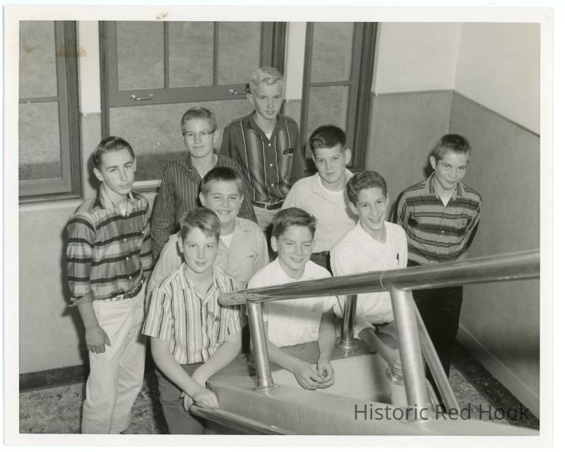 Junior High Hall Monitors 1958-59 pictured in the stairwell and identified as Dale Smith, Bob Grig, Pete Steinforth?, Don Hogan, John Meyers, Mike Bowe, Perry Odak, Kip Eggert, Austen? OrlichCollection