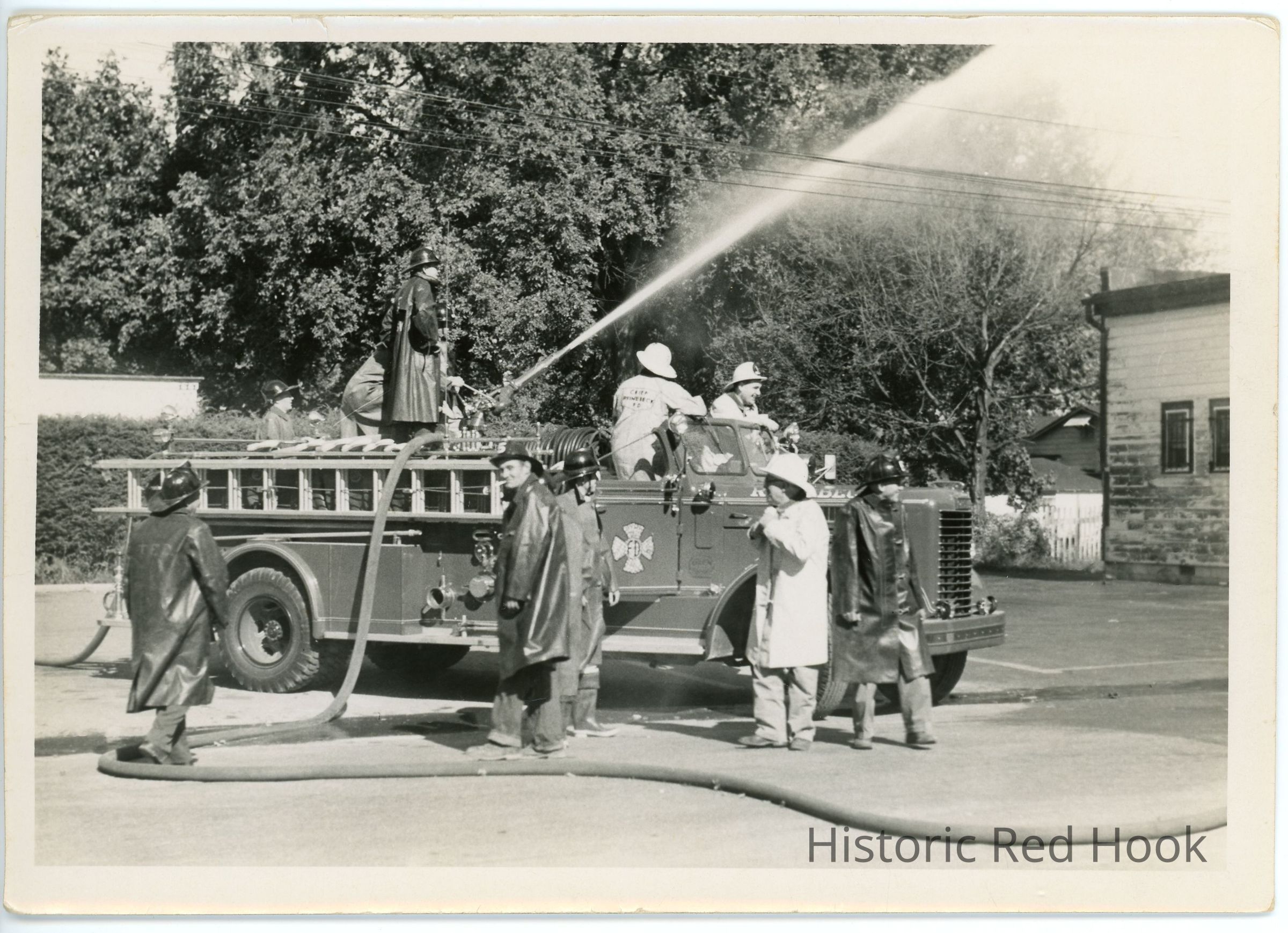 Scene of Red Hook Fire Department firemen hosing down building, early 1950s.Photograph Details